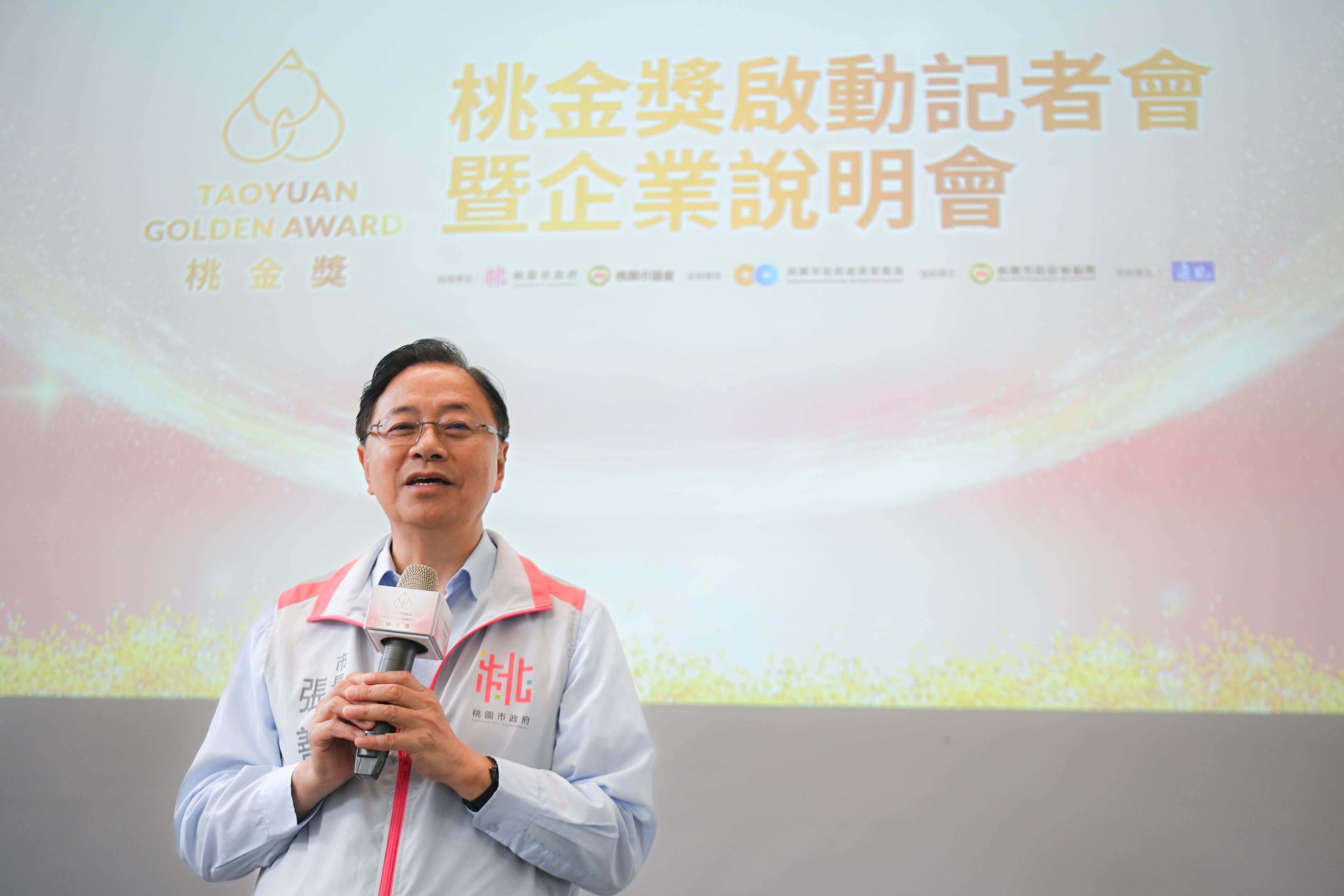 桃園市長張善政30日下午前往桃園區,出席「桃金企業獎啟動記者會暨說明會」。張市長表示,「桃金企業獎」為全台第一個縣市政府以企業ESG概念設計之獎項,尤其桃園為工業大城擁有多元企業,期盼藉由各面向評比找到兼顧幸福感及ESG全領域的標竿企業,並將優質企業風氣、氛圍及文化傳遞至桃園各個企業,將桃園打造成幸福工業城市,帶給大家永續及幸福的工作環境,吸引更多人來桃園發展。