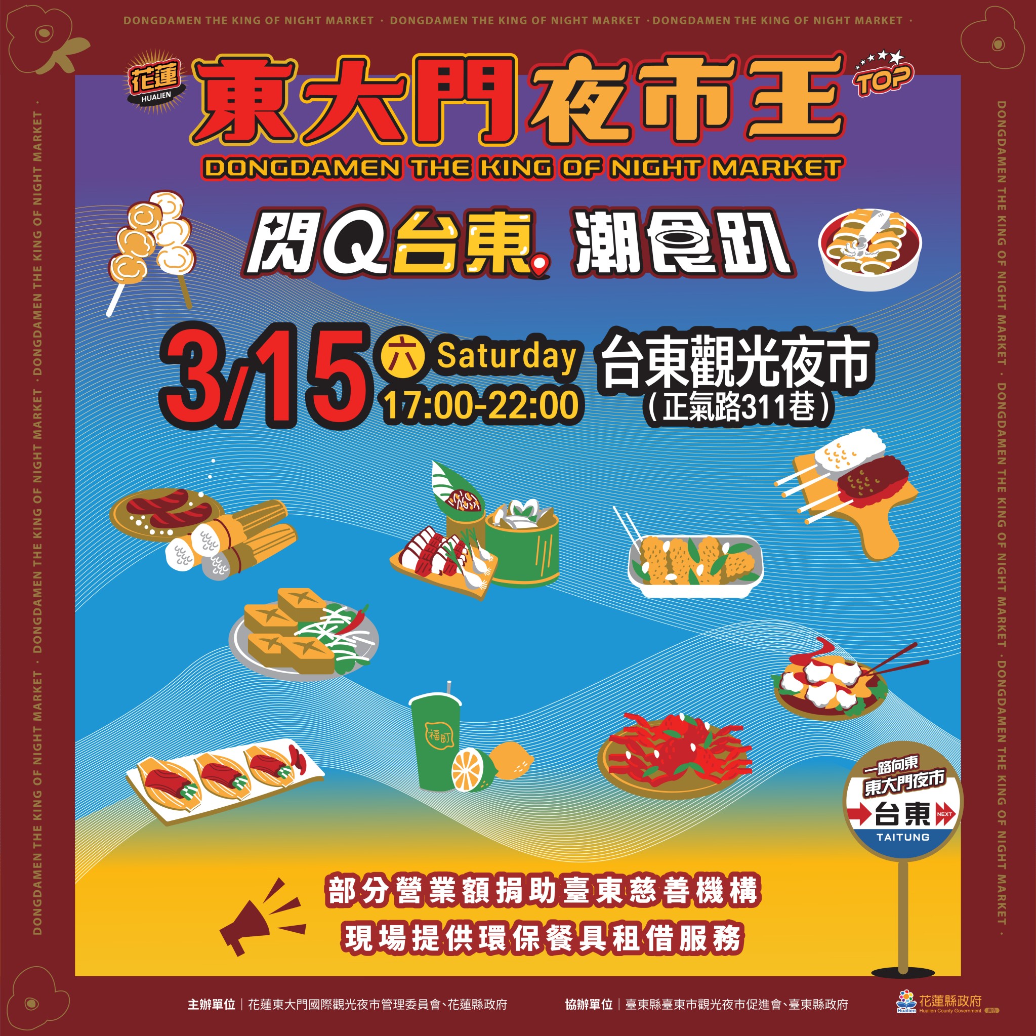 花蓮縣政府觀光處長余明勲表示,花蓮0403地震後受到了各地的協助,緊鄰的台東縣政府也特別邀請了花蓮的攤商、業者前往東浪嘉年華、熱氣球等熱鬧非凡的年度盛大活動擺攤,吸引了許多支持花蓮的人潮。而3月15日這次花蓮東大門夜市帶著感恩及滿滿的能量,為台東朋友們帶來一場夜市美食盛宴。並希望藉由這次公益快閃活動,凝聚更多溫暖的力量。