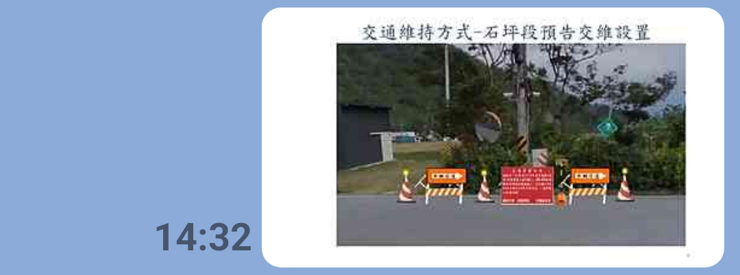 整體施工將依排定期程進行,並落實路況提早預告改道提醒,於工區範圍前後擺放改道預告牌面,提醒民眾欲行經施工路段,可提早改道或依現場改道預告牌面行駛。
