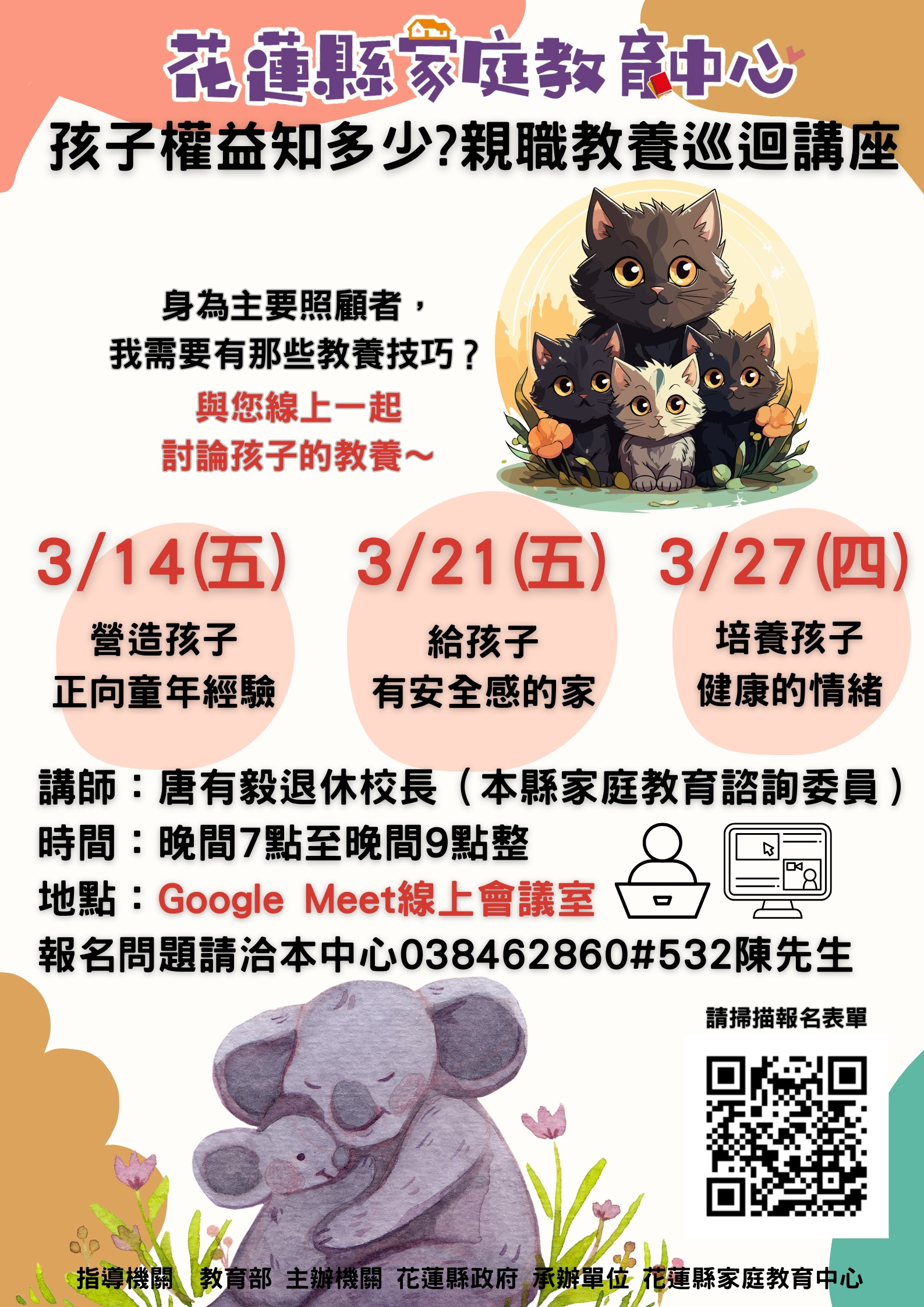 花蓮縣家庭教育中心主辦實體課程3場次、線上課程3場次。實體場次訂於3月11日、18日、25日上午時段在本縣婦幼親創園區舉行;線上課程則安排於3月14日、21日、27日晚間時段辦理,配合花蓮縣地勢狹長,交通不易抵達,期望讓更多家長能夠便利參與。