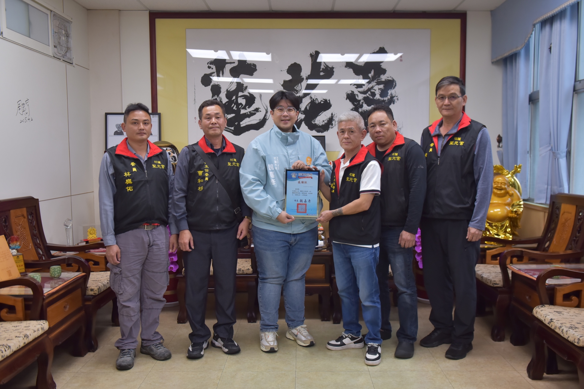 花蓮聖元宮副主委曹和杉、總幹事曹勝輝及多位委員7日下午前往花蓮市公所拜訪魏嘉彥市長,聖元宮捐贈白米挹注實物銀行的善舉已行之年,為了能擴大關懷的對象,特別與魏市長商討未來的捐助模式,魏嘉彥邀請聖元宮加入「奮進愛花蓮獎助學金」活動,透過禮券或餐券的方式鼓勵一些清寒學子奮發向上。