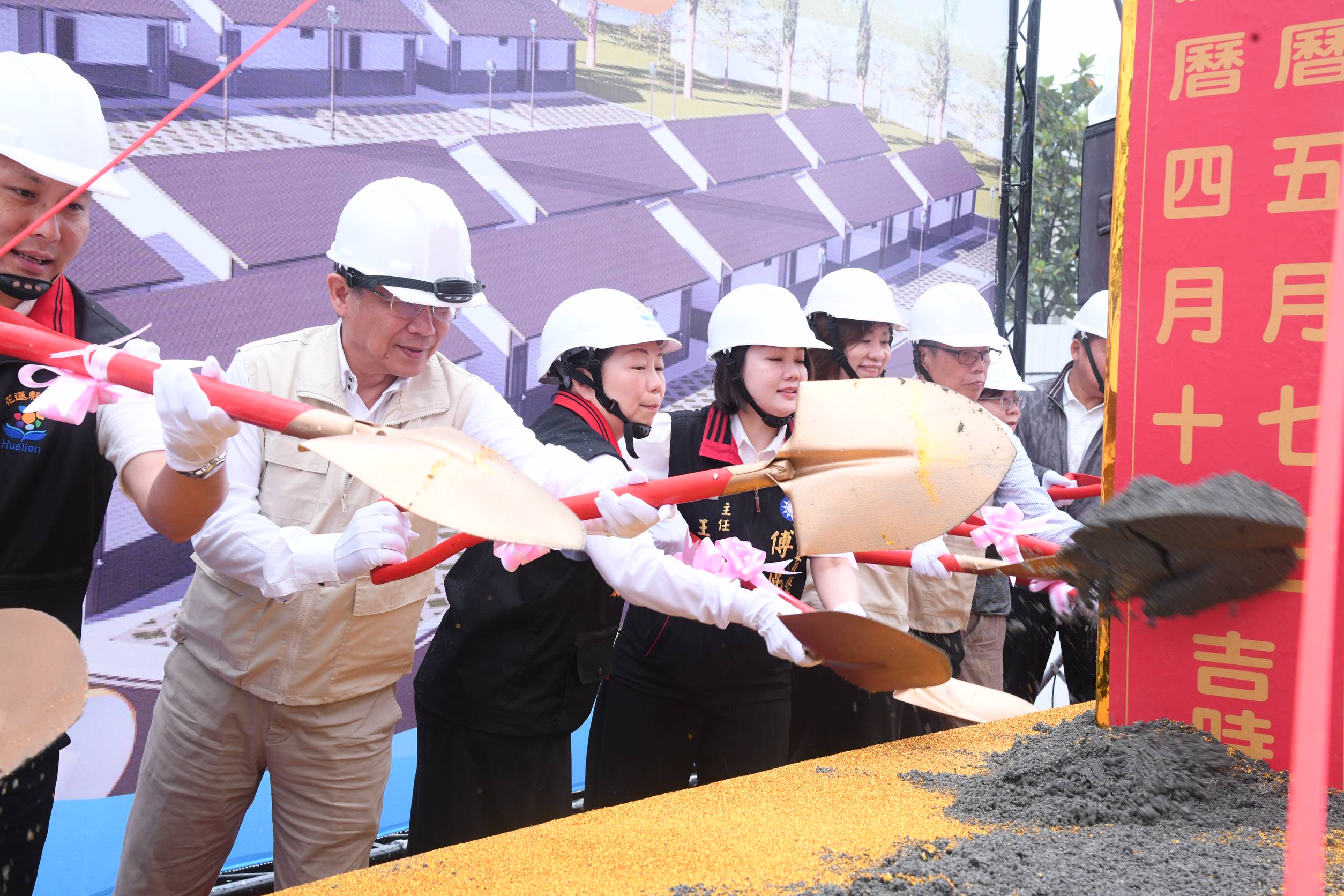 花蓮縣政府今(7)日舉行「0403震災中繼屋新建工程動土暨捐贈簽訂儀式」,由縣長徐榛蔚親自主持,並與中華民國紅十字會簽署2,800萬元捐贈儀式。徐縣長偕紅十字會會長潘維大及與會貴賓焚香祈福、持鏟動土,祈求新建工程圓滿順利,場面隆重。