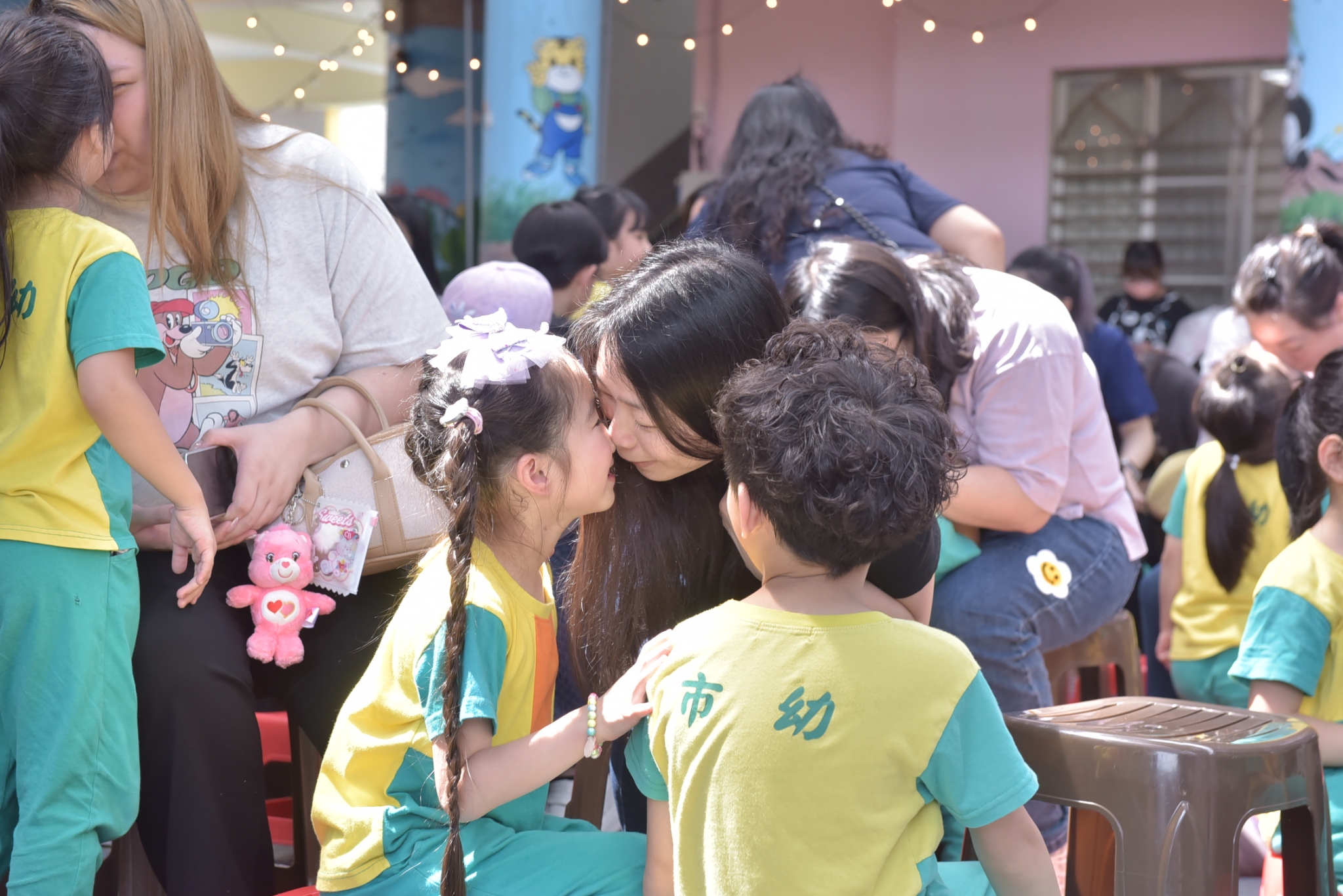 小班的小朋友在前一天下課後,便挺著氣球,不論是吃飯、睡覺,都感受到媽咪懷胎十月的不便;而中班的孩子也在日前親手製作雪Q餅,送給永遠貌美如花的母親們;而大班的孩子今天上午在市幼中庭與媽咪們親密互動,從一起跳舞開始,接著奉茶、塗乳液、按摩,然後媽媽們為孩子塗上口紅,讓孩子在臉上烙下愛的唇印。