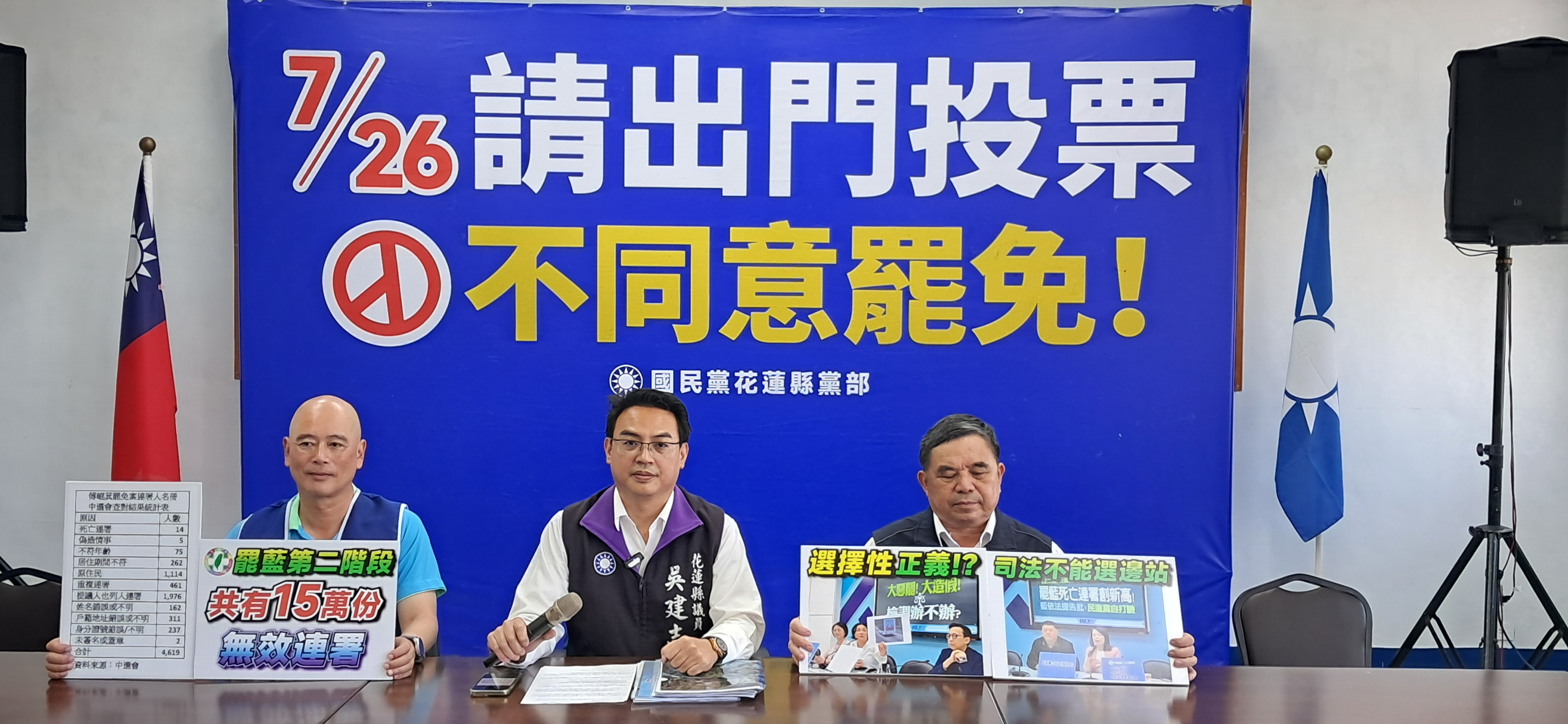 中國國民黨議會黨團今(4)日在花蓮國民黨縣黨部召開記者會。黨團書記長吳建志表示,針對屏東地檢署日前大動作搜索國民黨地方黨部,調查罷免民進黨立委伍麗華案的連署爭議,我們樂見司法積極作為、捍衛選舉公正。然而,令人震驚的是,中選會已明確揭示花蓮傅崐萁罷免案中也有14名死亡者連署、5件疑似偽造之情事,但花蓮地檢與相關司法單位卻至今按兵不動、毫無表示。這種對藍綠陣營「兩套標準、雙重尺度」的做法,已引發全民高度質疑,也讓台灣司法的公信力岌岌可危!