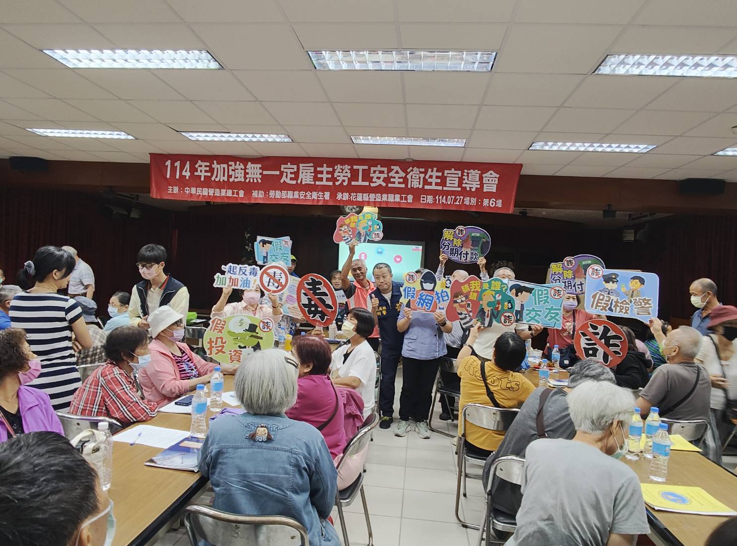 花蓮縣警察局持續推動「全民識詐」工作,於114年7月27日上午應邀出席花蓮縣營造業職業工會舉辦的會員大會,藉由本次集結縣內營造廠商與工地代表的場合,向與會會員進行反詐騙宣導,並推廣警政署「165打詐儀錶板」,以提升基層從業人員防詐知能,強化產業工地安全防線,藉此保護勞動階層辛勞所得。