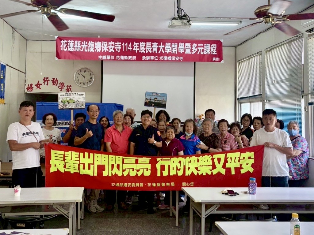 花蓮縣警察局鳳林分局光復分駐所員警日前到光復鄉保安寺長青大學,向學員們宣導交通安全及反詐騙等觀念,現場由保安寺董事長藍洋所率領50名學員在場聆聽,警方向學員宣導交通安全、反詐騙等觀念,以保障鄉親及學員人身及財產安全。