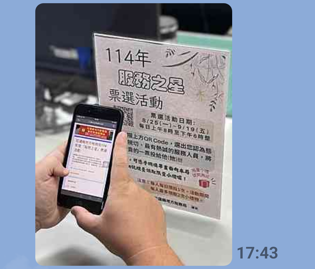 為鼓勵同仁秉持積極主動、耐心親切的態度服務民眾,花蓮縣地方稅務局即日起至9月19日止,舉辦114年度「服務之星」票選活動,活動期間歡迎洽公民眾踴躍參與票選活動,以實際行動支持並肯定具有服務熱忱的同仁,將選票投給心目中的他(她)。