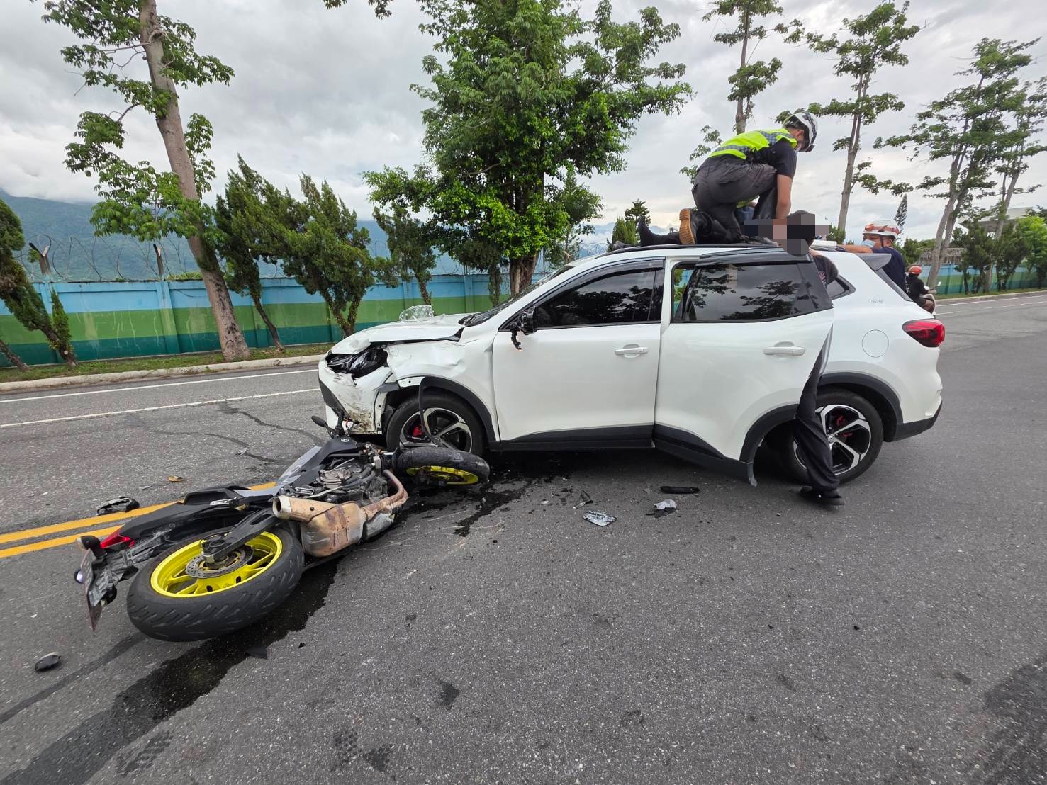 花蓮市昨(3)日下午4時許,一輛汽車沿花蓮市華西路東往西方向左轉,行駛與另一輛大型重機沿華西路南往北方向直行,雙方於路口處發生碰撞,造成機車騎士身體多處擦挫傷及疑似左手、腳骨折,經送醫診治後,目前尚在醫院治療中。