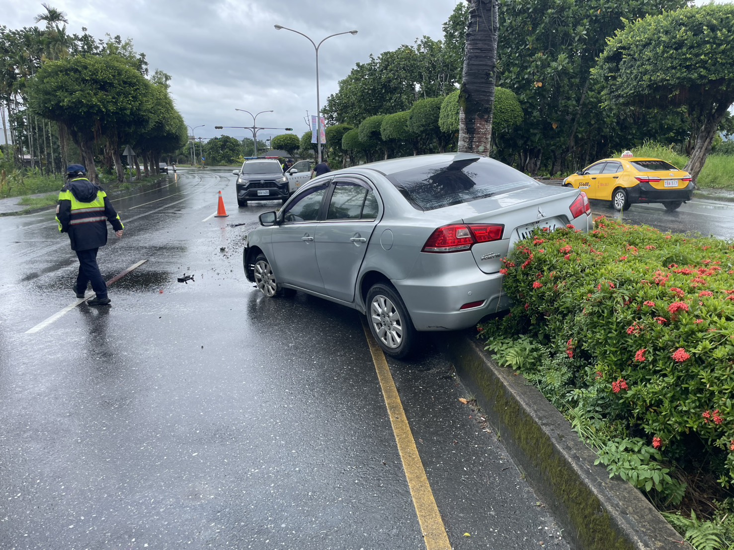 警方查看現場監視器影像,發現在許姓民眾駕駛自小客車沿臺9線由北向南行駛,行經鳳林鎮臺9線224.5公里時車輛失控打滑自撞分隔島,警方到場後發現許姓駕駛左手及右小腿擦挫傷,本分局後續將調閱行車記錄器以釐清事故詳情,全案依A2交通事故處理。