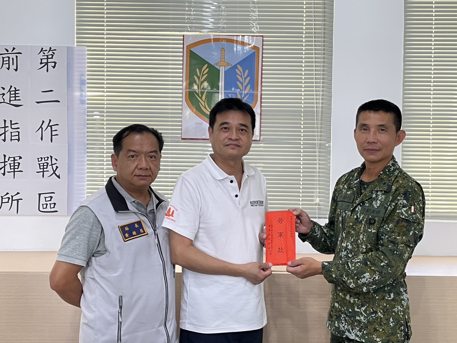 因樺加沙颱風襲台,花蓮光復鄉馬太鞍堰塞湖發生溢流,造成嚴重災損,海洋鋸片股份有限公司韓英傑董事長賢伉儷連繫花蓮縣軍人服務站黃鍾昌站長,於今(25)日1400時前往花蓮光復糖廠國軍前進指揮所致贈慰問金新台幣10萬元,由花東防衛指揮部指揮官劉中將受領,表達對堅守第一線國軍官兵的慰問與感謝。