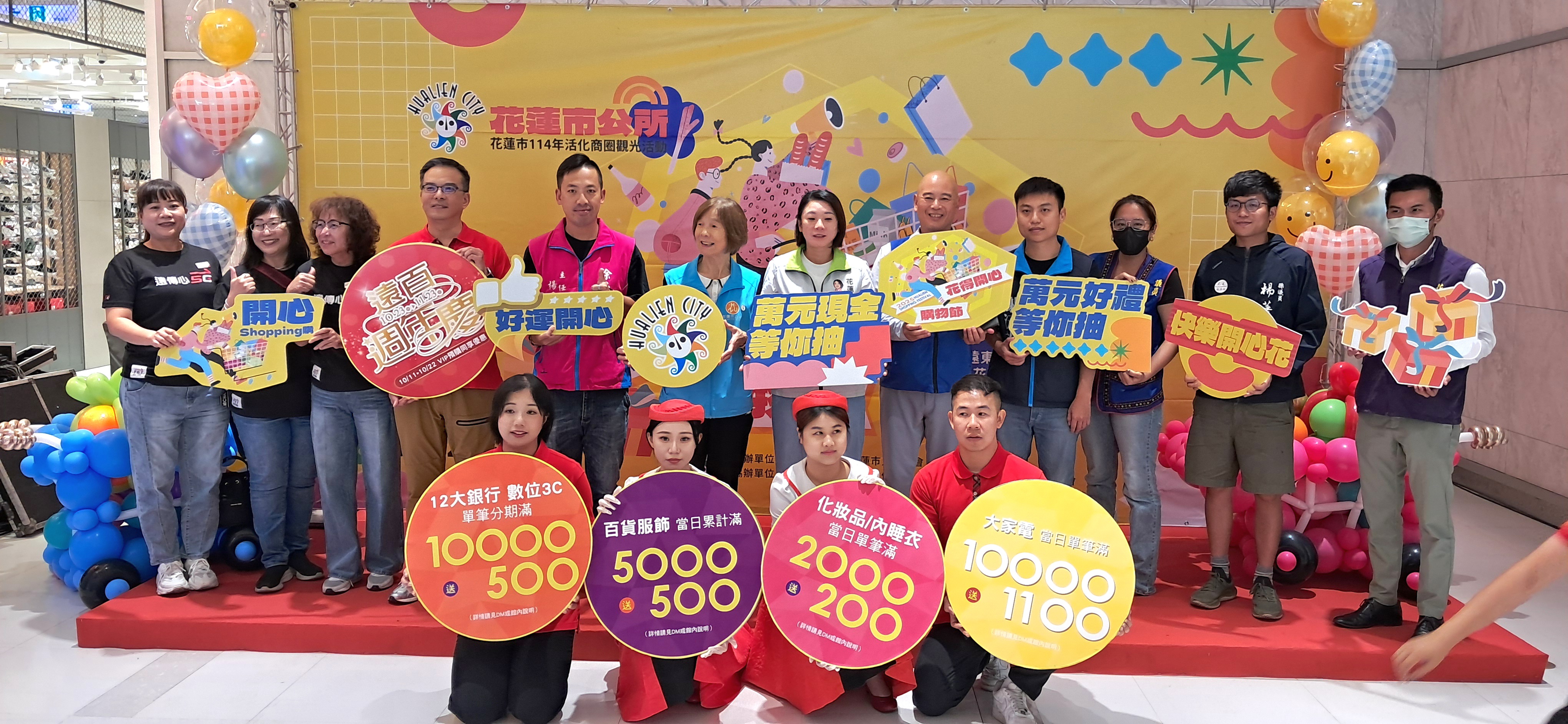 花蓮市公所今(16)日於遠東百貨花蓮店舉辦「花得開心購物節」啟動記者會,市公所主任秘書翁美華偕同與會貴賓共同啟動儀式,邀請全國民眾來花蓮旅遊購物,體驗在地商圈的熱情活力,並把多項豐富大獎帶回家。