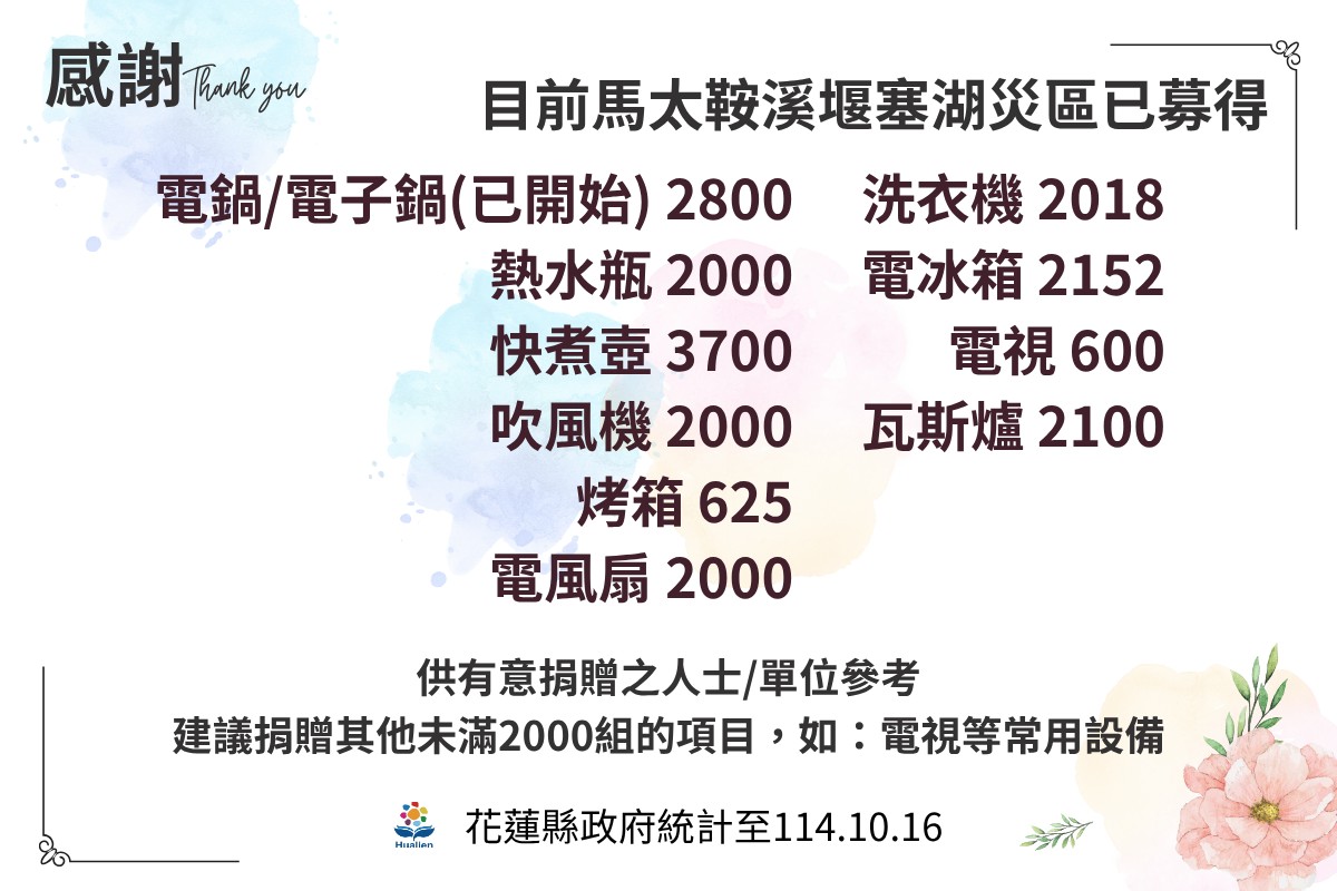 截至目前,災區已募得各類家電有瓦斯爐2,100台、吹風機2,000台、熱水瓶2,000台、電鍋及電子鍋2,800台、烤箱625台、電風扇2,000台、洗衣機2,018台、電冰箱2,152台、快煮壺3,700台及電視600台。花蓮縣政府感謝各界善心捐助,讓社會各方的關懷匯聚,為災後重建帶來力量。