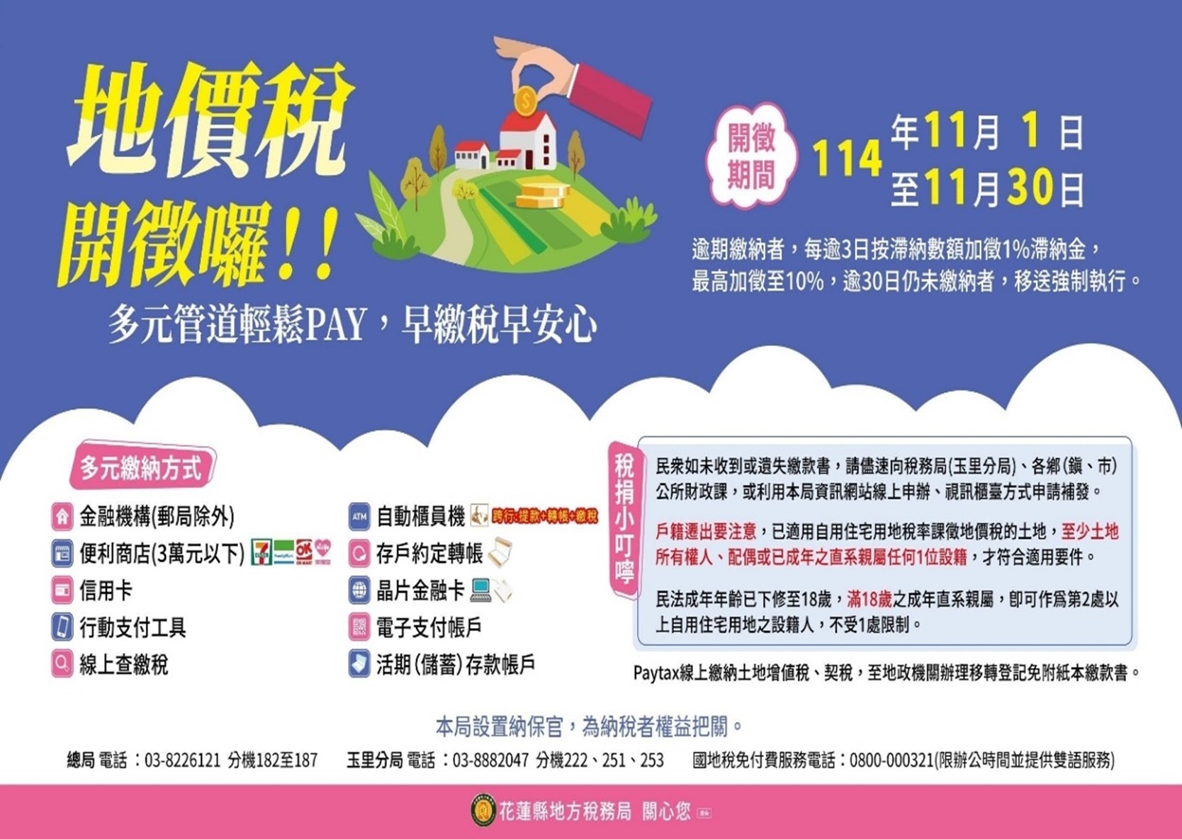 另外,為方便民眾繳納稅款,該局提供多元化繳稅管道,例如:便利超商繳稅(限額3萬元)、自動櫃員機、信用卡繳稅、晶片金融卡網際網路繳稅、運用自然人/工商憑證等「線上查繳稅」或透過「行動支付工具」掃描QR Code繳稅,民眾可多加利用,免出門也能完納稅捐,如以金融機構存款帳戶委託轉帳代繳地價稅者,請記得於繳納期間截至日(12月1日)在帳戶內預留存款,以備提兌。