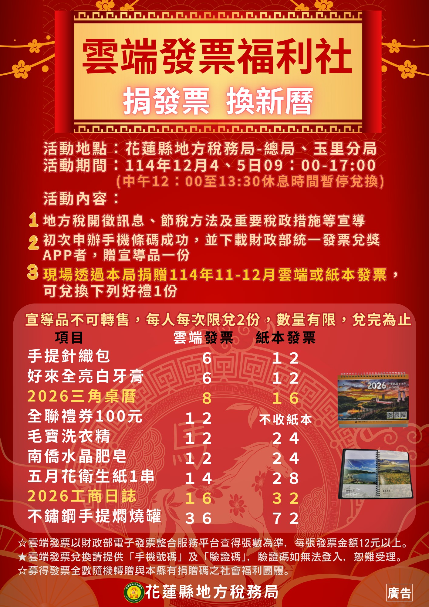 花蓮縣地方稅務局邀您於本(114)年12月4-5日上午9時至下午5時「捐發票換新曆」(中午12時至1時30分休息時間暫停兌換)!鄉親持本年11至12月未列印買受人統一編號雲端(紙本)發票至該局或玉里分局,即可依所列捐贈張數(6至72張)兌換三角桌曆、工商日誌、禮券、衛生紙、洗衣精及牙膏等實用品,每人每次限兌換2份(數量有限,兌完為止),募得之發票全數轉贈本縣社福團體,請鄉親廣邀親朋好友共襄盛舉。