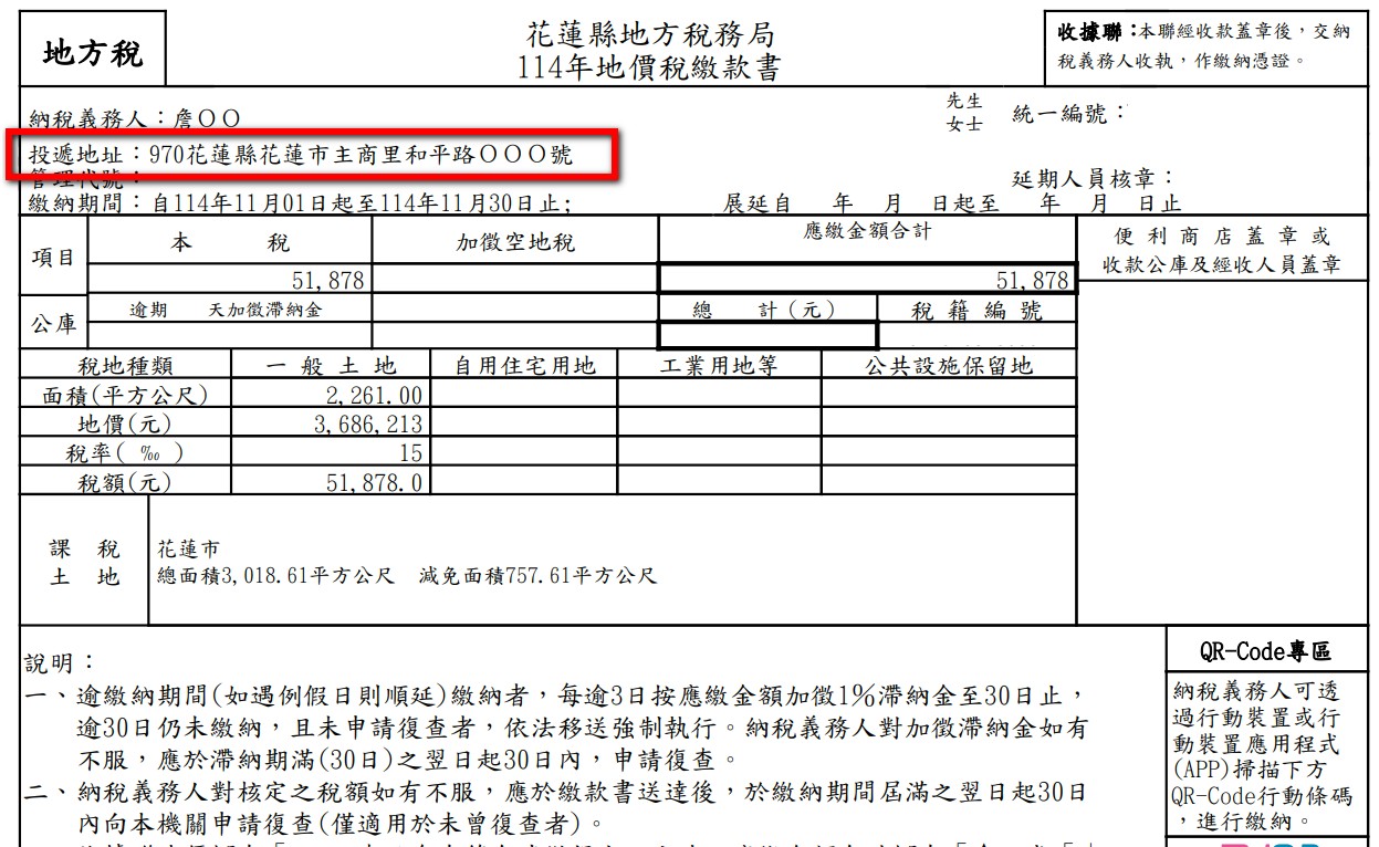 花蓮縣地方稅務局表示,每年地價稅開徵時,常接獲民眾表示未收到繳款書情形,稅務局特別提醒民眾,住家如有搬遷或通訊地址變動情形時,請記得通知該局更改繳款書投遞地址。