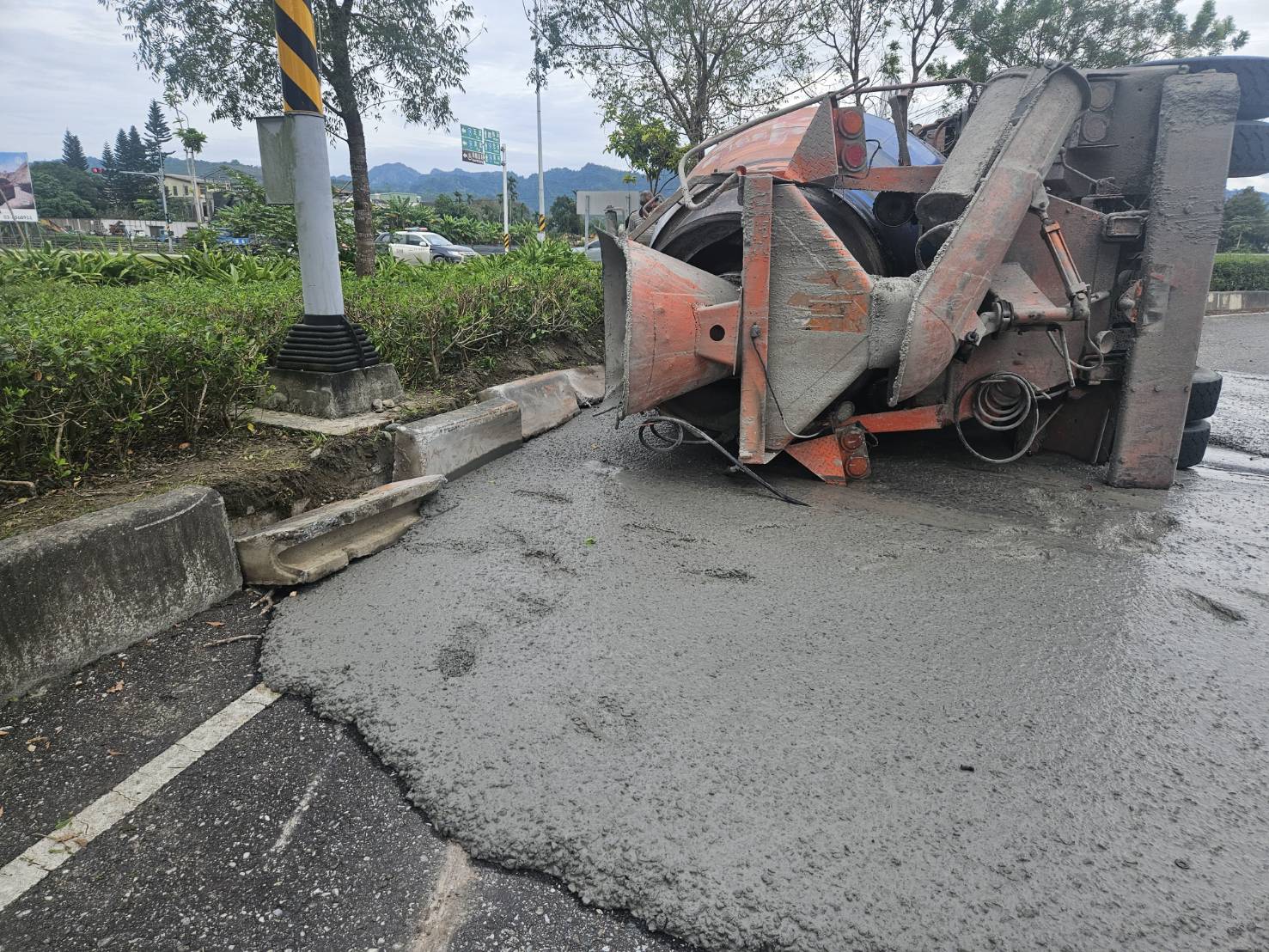事故發生於迴轉道內,現場大量水泥覆蓋路面,警方到場後,立即封鎖迴轉道進行交通管制,主線車道通行不受影響。目前現場由拖吊車業者進行車輛拖吊及路面清理作業,預計短時間內完成恢復。