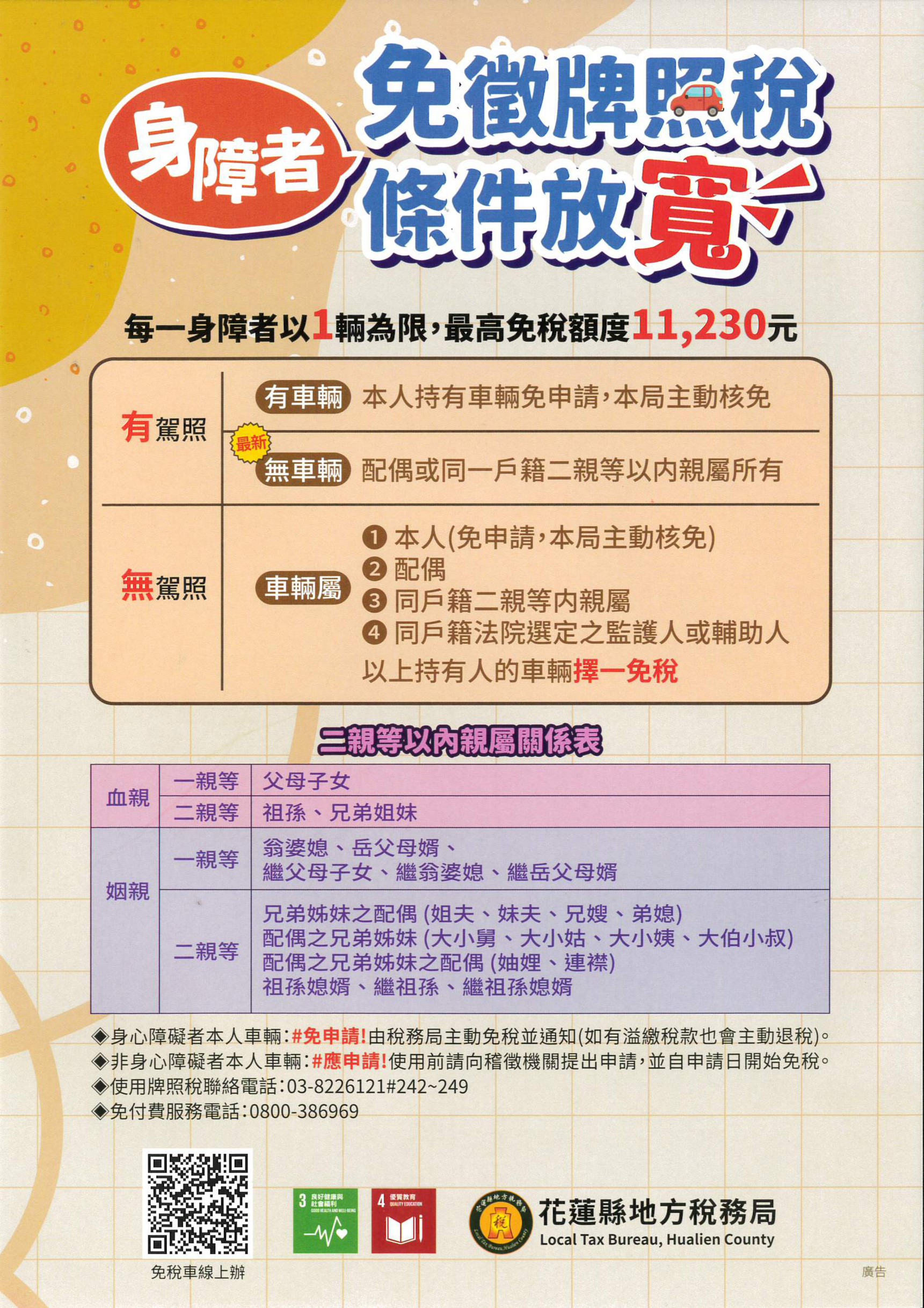 花蓮縣地方稅務局表示,自114年1月17日起,財政部函釋放寬領有駕照之身障者,即使名下沒有車輛,可以其配偶或同一戶籍二親等以內親屬所有供該身障者使用的車輛,申請免徵使用牌照稅,每一身障者以1輛為限,免徵稅額以汽缸總排氣量2,400cc車輛稅額為限,超過部分不予免徵。
