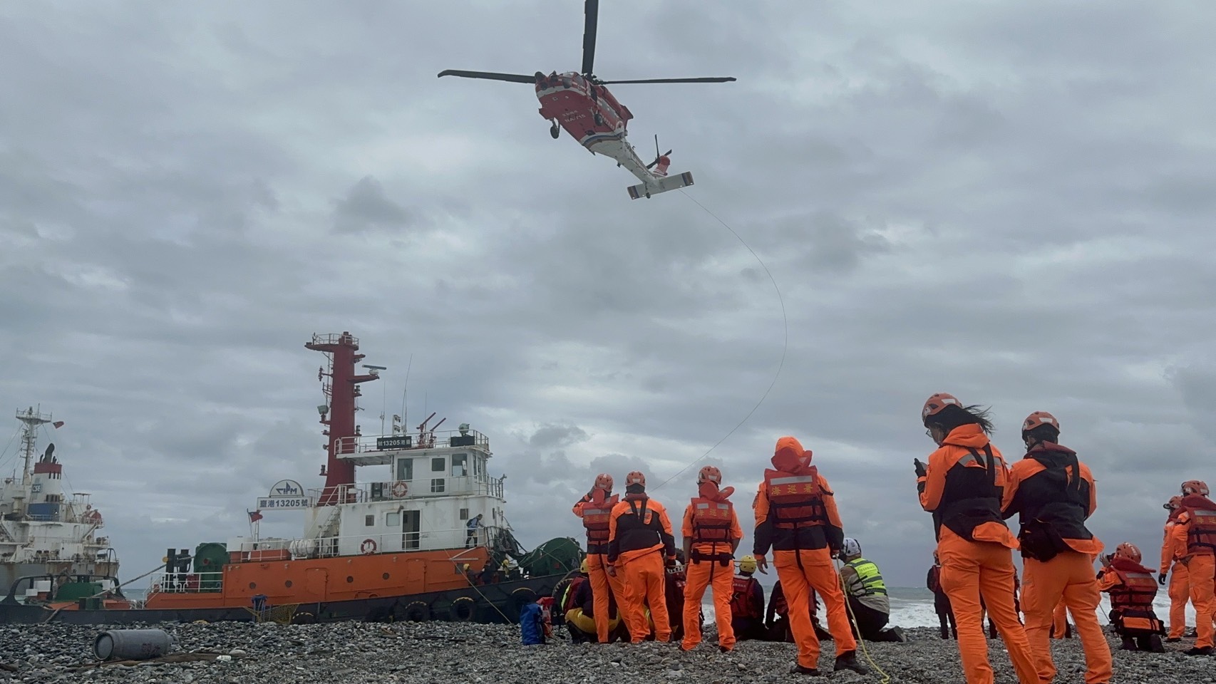 東部分署表示,經初步掌握,現場另有1艘前往執行救援「通鴻」貨輪脫困之拖船,因受強勁風浪影響,於作業期間坐灘受困,拖船上共5人,其中1人身體不適。為確保人員安全,第九巡防區立即申請空偵機實施吊掛,拖船上5名船員均由海巡署空勤吊掛隊順利全數吊掛至岸際安全區域。
