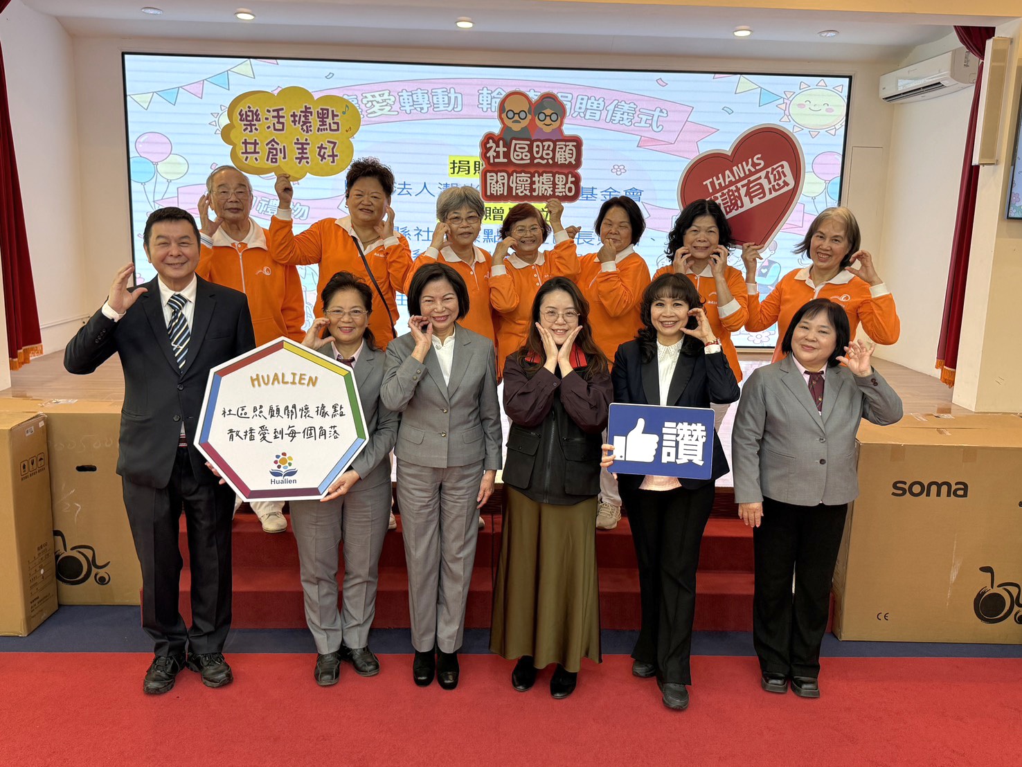 助行器35,單手拐杖30,輪椅共273項,主動將資源整合協助花蓮給予長者特別的需求,今天董事長程錦緞親自出席外,花蓮辦事處處長王瑞璧及多位組別幹部、志工代表共11位到場,展現基金會對花蓮在地社區照護與公益服務的高度重視與支持。