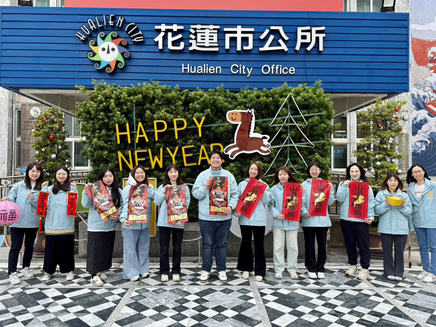 花蓮市公所今年第七度攜手知名插畫家DUNCAN,推出「山海騰駿」新春春聯,以Q版小馬為主題,搭配「山海騰駿」題字,象徵花蓮得天獨厚的好山好水,也寓意駿馬奔騰、諸事順利,祝福花蓮在新的一年持續向前、蓬勃發展。