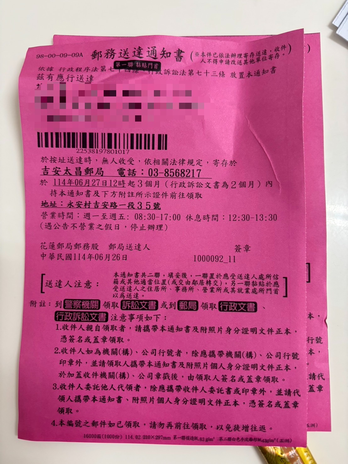 花蓮縣地方稅務局表示,繳款書的投遞地址原則上是以戶籍地為主,若民眾實際上並未居住在戶籍地,可以申請新增通訊地址,稅務局就會優先將稅單寄至新的通訊地。繳款書寄至戶籍地或通訊地,如因納稅義務人不在,未能領取,且無其他可受領人員時,郵局會將送達通知書,一份黏貼於應受送達處所的大門,一份交由鄰居轉交或放在信箱,再將繳款書寄存在郵局後就發生送達效力,也就是寄存送達。