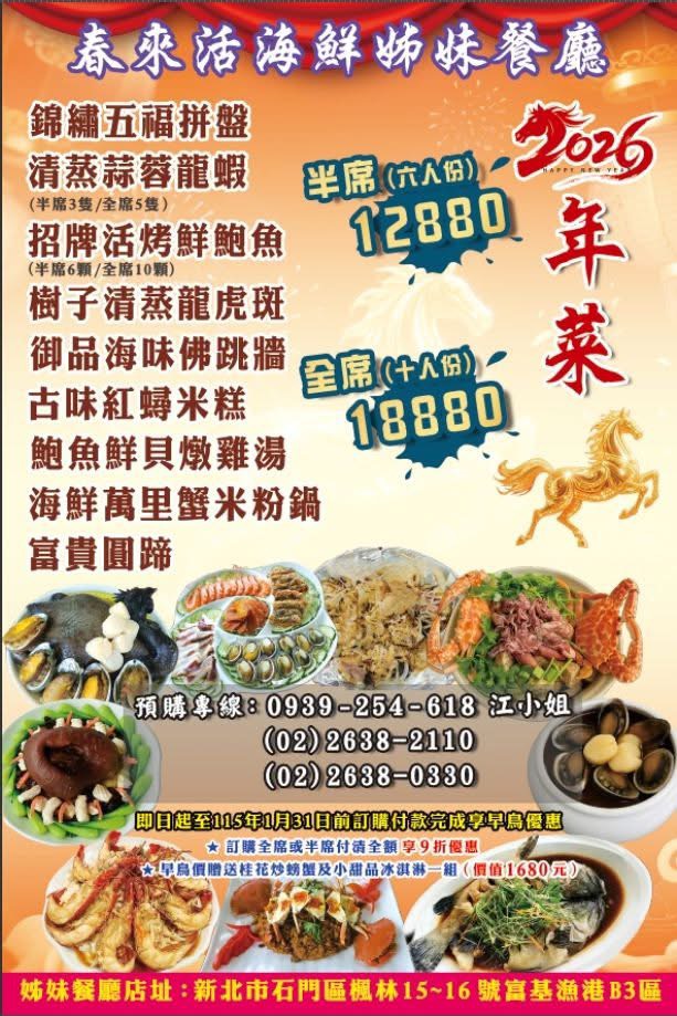 歲末迎春,新北市石門區富基魚市迎接金馬年春節,推出春節限定「打卡贈好禮」及「福氣滿滿送元寶」活動,並提供豐盛的年菜海味套餐。新北市漁業處誠摯邀請民眾春節走訪北海岸石門,欣賞富貴角燈塔、老梅綠石槽等自然美景,造訪石門婚紗廣場與風箏公園等特色景點,一邊走春賞景、一邊品嚐海鮮,一次滿足全家大小旅遊與美食需求。