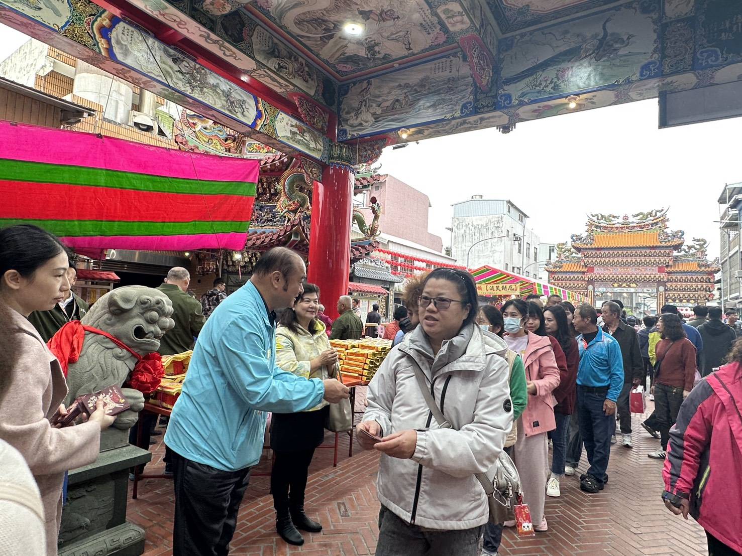 一早廟埕即湧入大批前來走春參拜的民眾,現場洋溢濃厚年節喜氣。龔鎮長逐一將象徵吉祥好運的福袋送到鄉親手中,並親切與民眾握手致意、互道恭喜,不少民眾攜家帶眷排隊領取,場面溫馨熱絡。