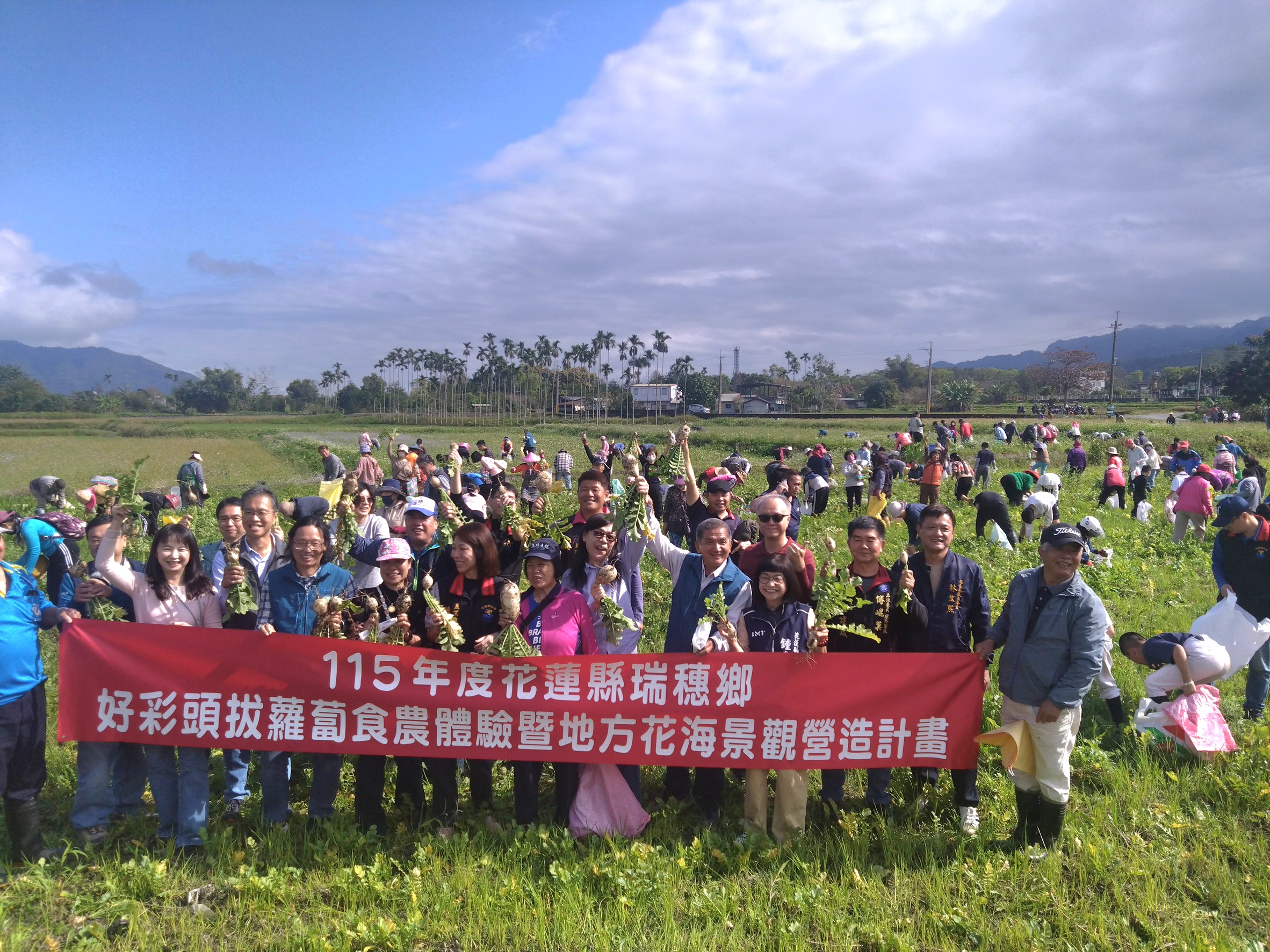為深化食農教育推廣、拉近民眾與土地的距離,花蓮縣政府攜手瑞穗鄉農會辦理「拔蘿蔔田間體驗活動」,邀請親子家庭、學校團體及社區民眾走入瑞穗鄉農田,親手體驗採收當季新鮮蘿蔔的樂趣。透過實際參與農事過程,讓民眾了解農作物從播種到收成的辛勞,也在與土地接觸的過程中,留下難得的生活記憶。