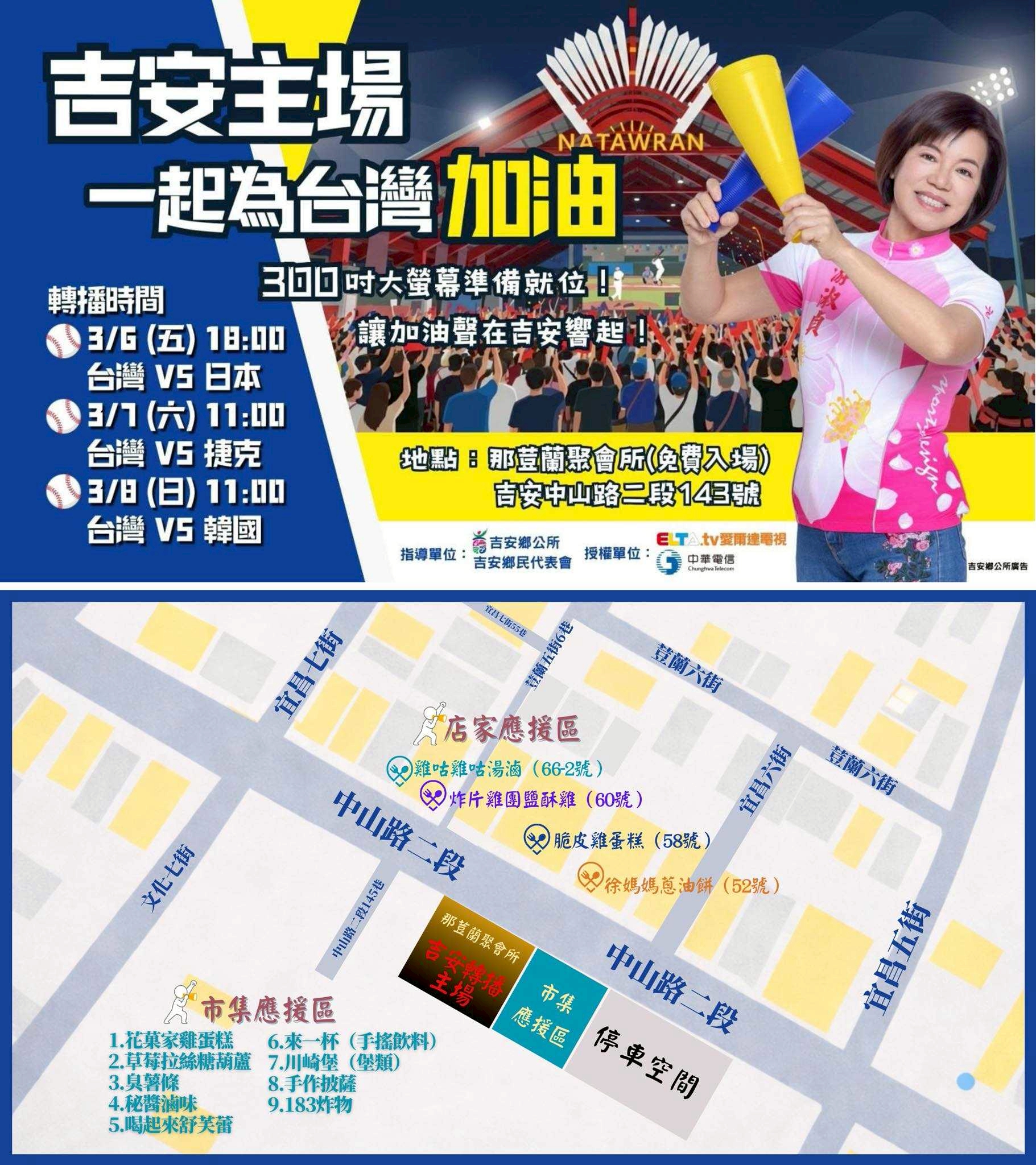 鄉長游淑貞表示,感謝吉安鄉民代表會全力支持本次活動,在地宮廟連續三天,每日提供300份限量炸雞排,愛爾達電視授權高畫質公播訊號及在地中華電信協助線路架設等,讓大家能完整觀賞預賽三場賽事,後續也將視晉級情形持續安排轉播,讓鄉親不必遠行,就能齊聚一堂為台灣加油。