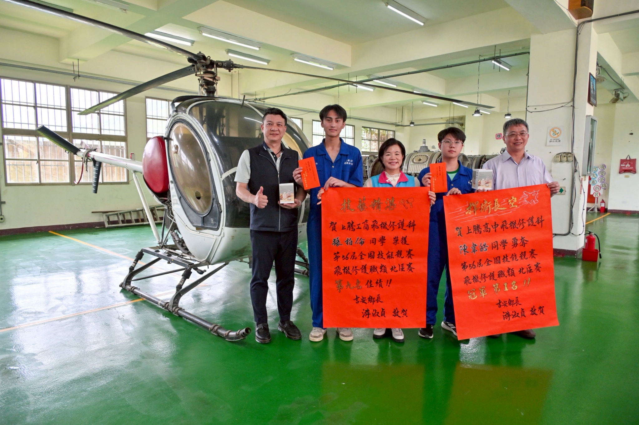 吉安鄉長游淑貞(9)日赴上騰工商為獲得第56屆全國技能競賽飛機修護職類北區第一名的陳韋皓、第九名的張柏倫頒贈紅榜祝賀為校爭光、為鄉爭光,同時關切該校老師的教學與同學們在技術學習上的生活點滴,也勉勵師生,期待下一屆獲得更多名次,並跟同學們相約,下次同學獲獎時,會再來祝福大家。