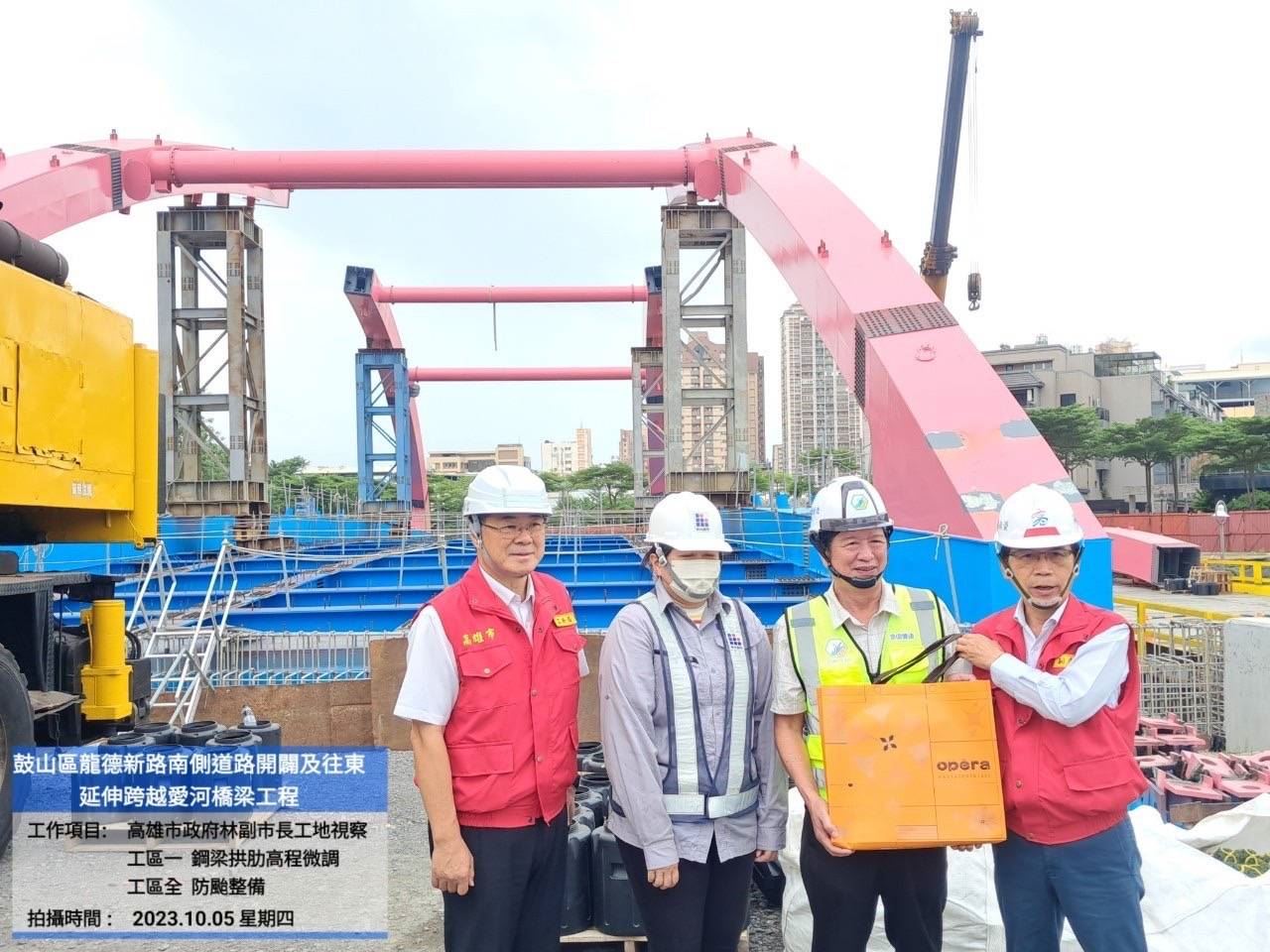 小犬颱風來勢洶洶,副市長林欽榮5日帶領團隊至工務局新工處的「鼓山區龍德新路南側道路開闢及往東延伸跨越愛河橋梁工程」進行防汛整備視察,該工程防汛整備成效極佳,目前進行鋼構橋梁吊掛工程,現況已完成整體主構件80%,剩餘上拱肋(中間)閉合段10%,尚有兩側人行道小構件部份10%,總體工程預定進度46.66%、實際進度57.94%,超前11.28%,力拼年底達通車目標。