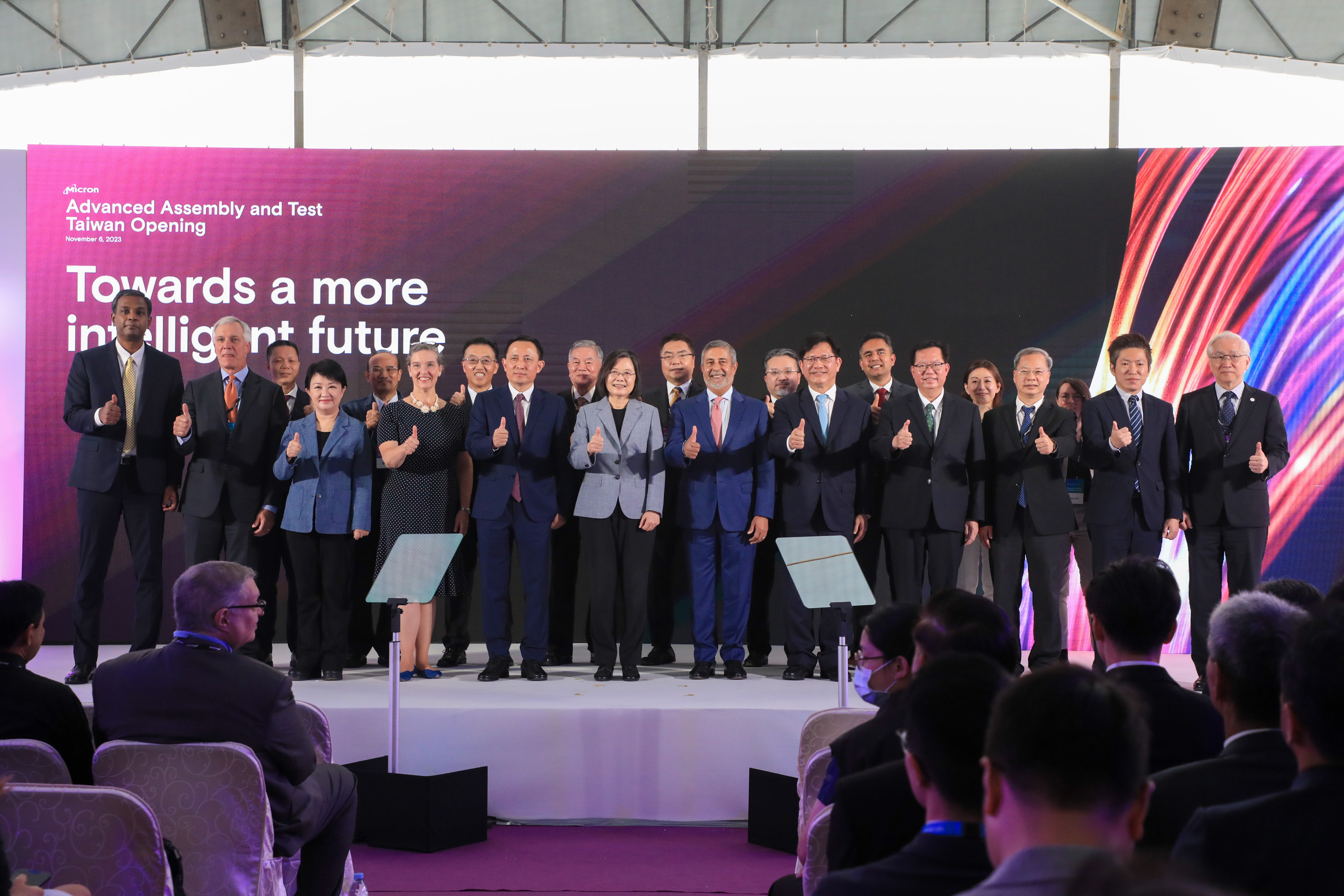 今日開幕典禮,總統蔡英文、台中市長盧秀燕、總統府資政沈榮津、總統府秘書長林佳龍、行政院副院長鄭文燦、經濟部產業發展署長連錦漳、國家科學及技術委員會主任委員吳政忠、國家發展委員會主任委員龔明鑫、美國在台協會處長孫曉雅(Sandra Oudkirk)、美光總裁暨執行長梅羅特拉(Sanjay Mehrotra)、美光技術開發事業部資深副總裁陳德拉斯卡蘭(Naga Chandrasekaran)、美光前段製造企業副總裁暨台灣美光董事長盧東暉及美光先進封裝技術開發處副總裁辛赫(Akshay Singh)、中市府經發局長張峯源均到場共襄盛舉。