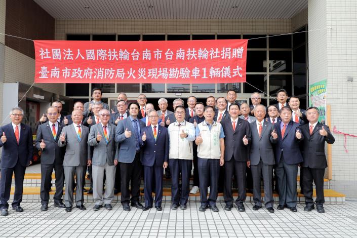 台南市台南扶輪社為提升台南市火災調查能量及效率,捐贈1台火災現場勘驗車給予台南市政府,市長黃偉哲今(7)日出席捐贈儀式代表受贈,並回贈感謝狀感謝台南扶輪社的善行義舉與公益,為地方百姓造福。