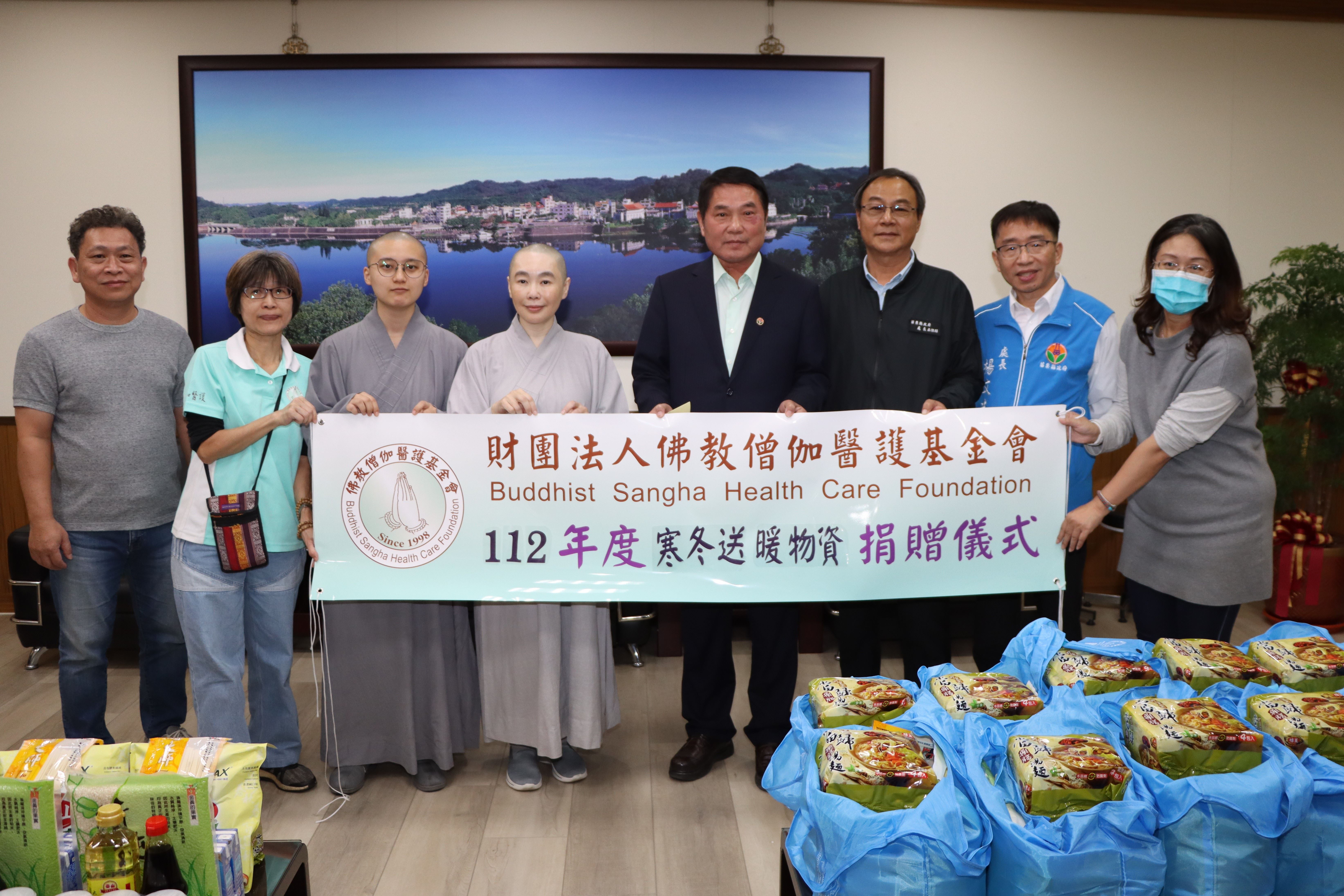 財團法人佛教僧伽醫護基金會11月20日捐贈1200份歲末寒冬送暖物資,苗栗縣長鍾東錦回贈感謝狀感謝基金會善舉,而僧伽醫護基金會於後龍籌建安養院,期待能提供現代醫療養護的專業服務地方長者,同時也照顧附近居民的健康。