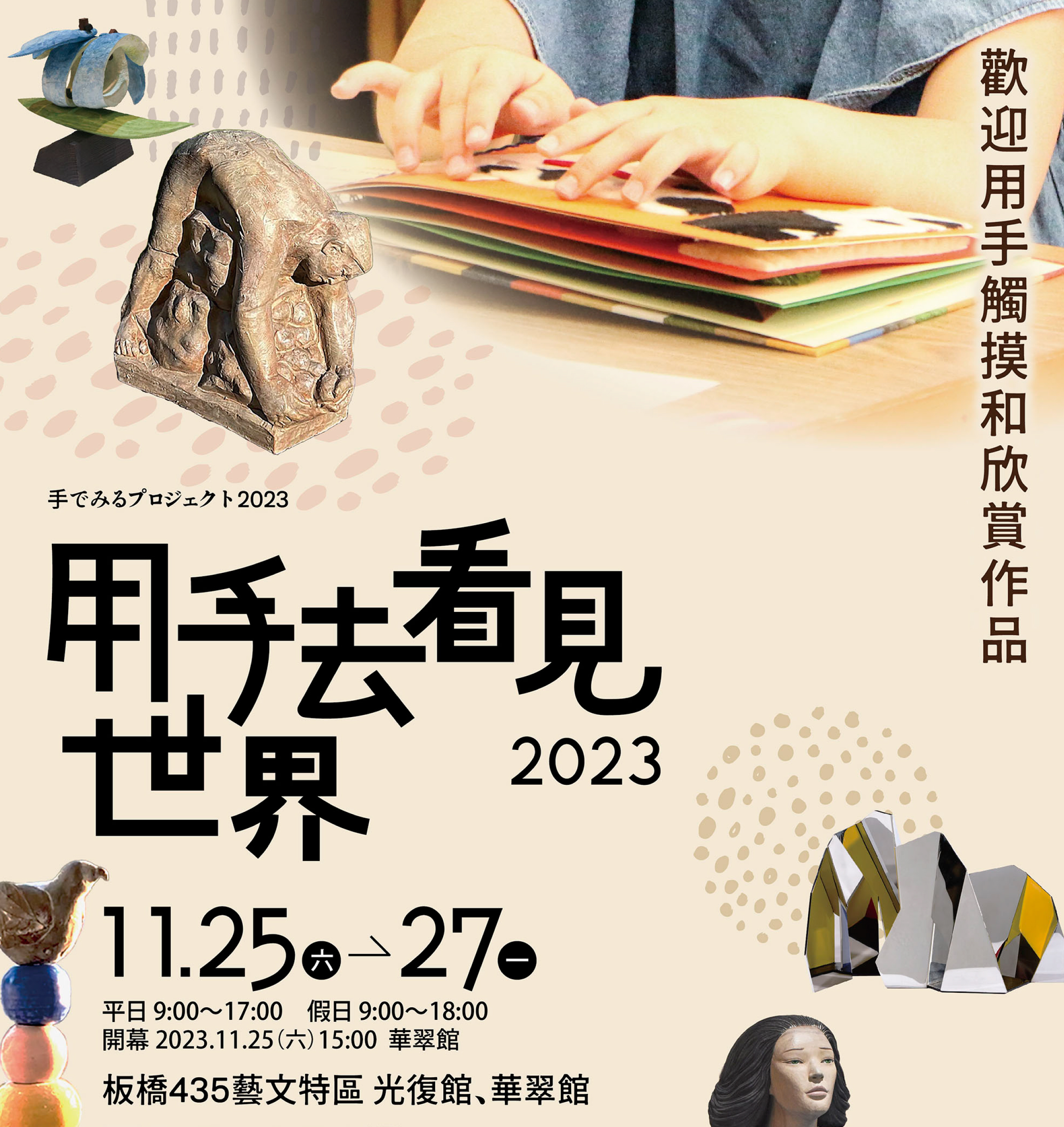 《2023用手看見世界》臺日觸覺交流展覽及工作坊,將於11月25日至27日,在板橋435藝文特區光復館、華翠館展出。本次展覽以「觸覺」為主要觀展途徑,展出的雕塑及作品皆可觸碰感受材質紋理,並同步展出來自義大利藝術家的「可觸摸繪本」、臺灣觸覺教材及臺北市立啟明學校學生創作,希望提供民眾及視覺障礙者平權無礙的藝文展覽體驗。