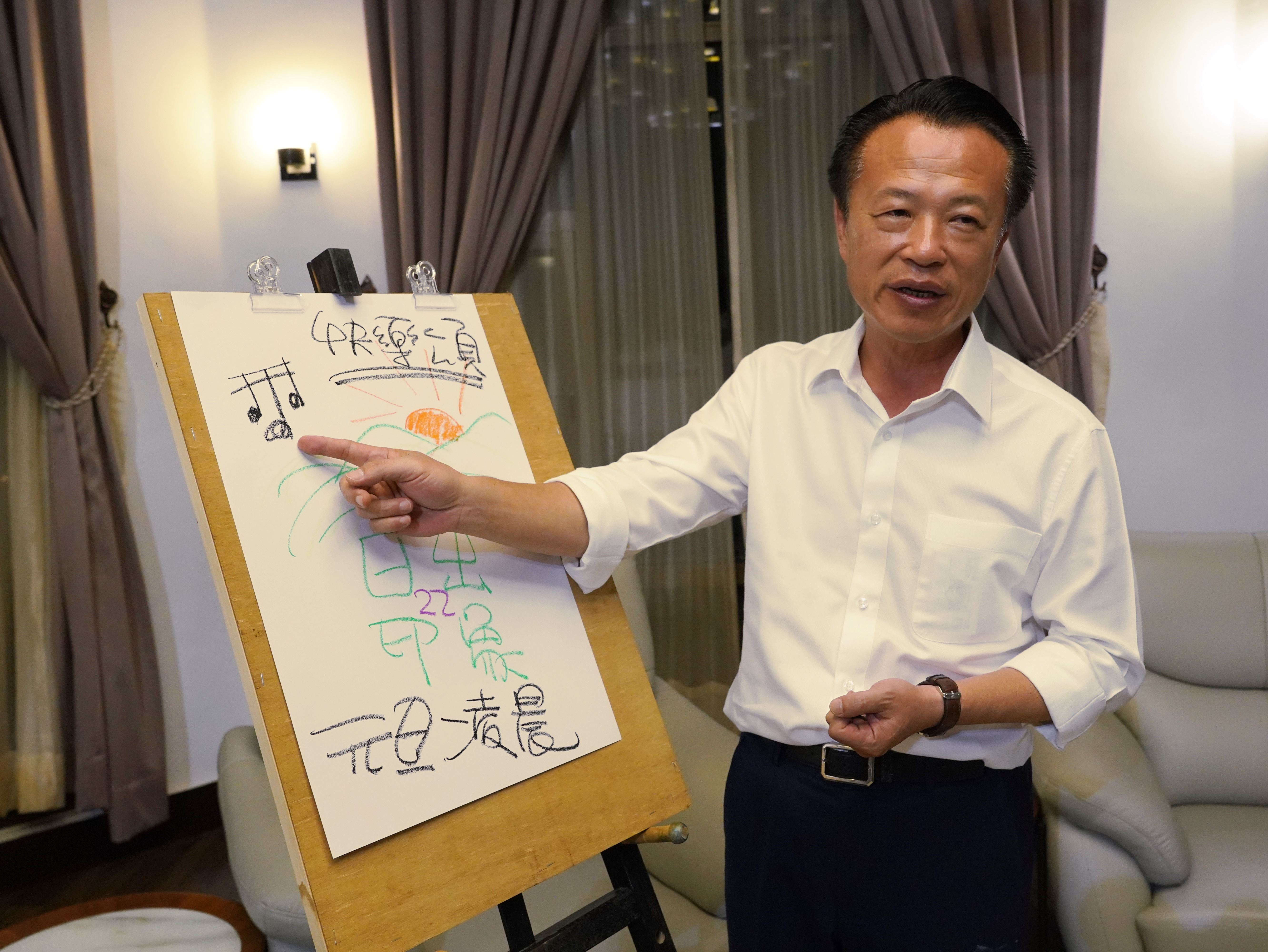 為迎接2024阿里山日出印象音樂會,嘉義縣長翁章梁親手描繪活動主視覺草稿,將腦海裡的「阿里山」一筆一畫呈現,透過圖畫傳達阿里山最純淨的美,有層疊的山峰及雲海,搭配高品質的音樂表演,當太陽昇起那一刻,整顆心都溫暖了。