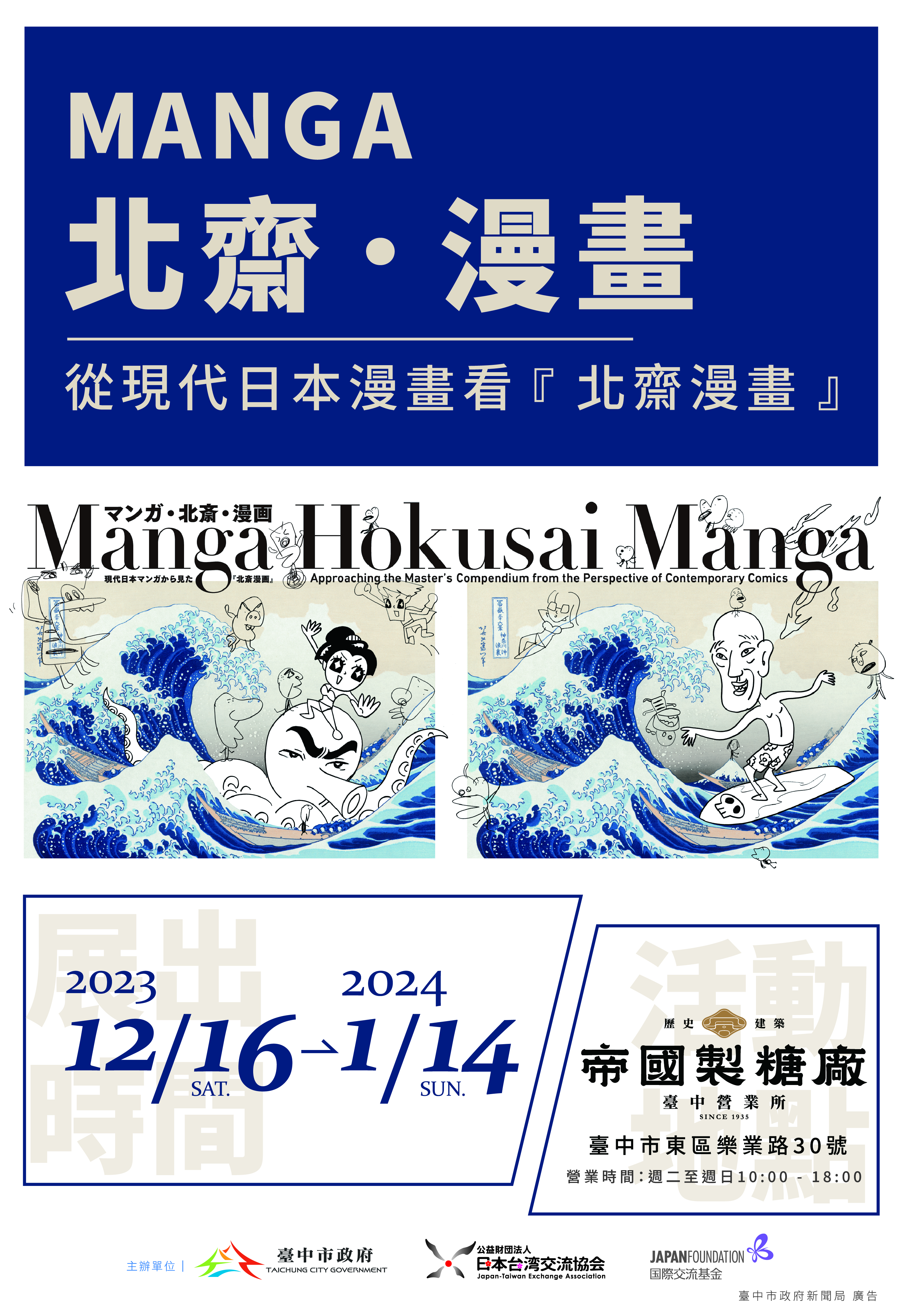 台中市政府新聞局與日本國際交流基金會、日本台灣交流協會合作,共同舉辦「Manga北齋漫畫展:從現代日本漫畫看『北齋漫畫』」,自今年12月16日至明年1月14日在帝國製糖場台中營業所展出。新聞局表示,這次展覽為台灣首站,精選103件圖畫作品由海外運輸抵台,串聯周邊綠柳川耶誕活動和國家漫畫博物館,是民眾冬季輕旅行的絕佳選擇。 新聞局指出,巡迴展先前已在羅馬等城市展出並廣受好評,許多粉絲將「北齋漫畫」視為現代漫畫的起源,這次展覽從現代日本漫畫角度探討與北齋漫畫的差異,展出103件圖畫作品,包含浮世繪大師葛飾北齋、歌川國芳的戲畫、鳥羽繪等江戶時代作品,還有望月壽城、橫山裕一等7位現代漫畫家致敬北齋漫畫的作品,展示江戶時代北齋漫畫的文化及魅力。