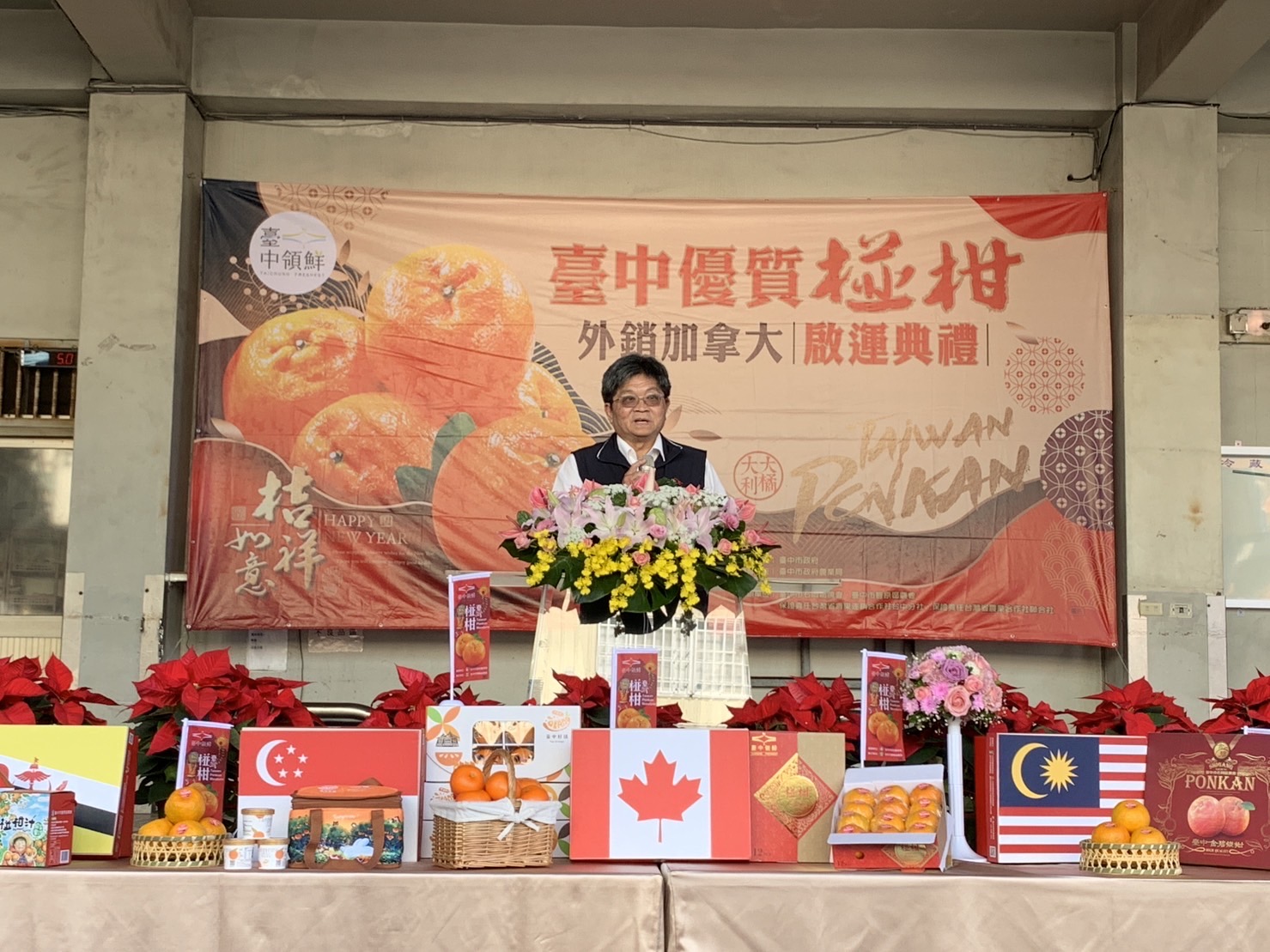 台中市政府農業局持續輔導農民團體外銷農特產品,積極開拓海外通路,15日於東勢果菜市場舉辦台中優質椪柑外銷加拿大啟運典禮,將台中市酸甜適中的優質椪柑外銷至北美市場,提升農民收益。農業局表示,今日外銷加拿大啟運1櫃(20公噸),後續也將出口至新加坡、馬來西亞、汶萊及日本等國家,今年冬季預計外銷椪柑650公噸。