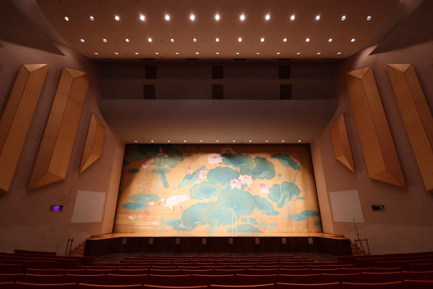 文化局表示,有別於一般表演廳的大幕,嘉義市音樂廳大幕是以嘉義前輩畫家林玉山老師「蓮池」(受指定為臺灣現代畫家的第一件國寶級作品)為藍本,當時由熱心市民及藝術愛好者共同募款500萬元,委託日本京都「龍村美術織物株式會社」織造,約50名專家參與、20名專業職人織造,以著名「西陣織」手法,使用金、銀箔紗等88種色紗,一針一線手工編織,耗時近8個月,完成高8.5公尺、寬19.44公尺的大型珍貴緞帳,在音樂廳啟用時以其豐華大氣之姿呈現於市民眼前。