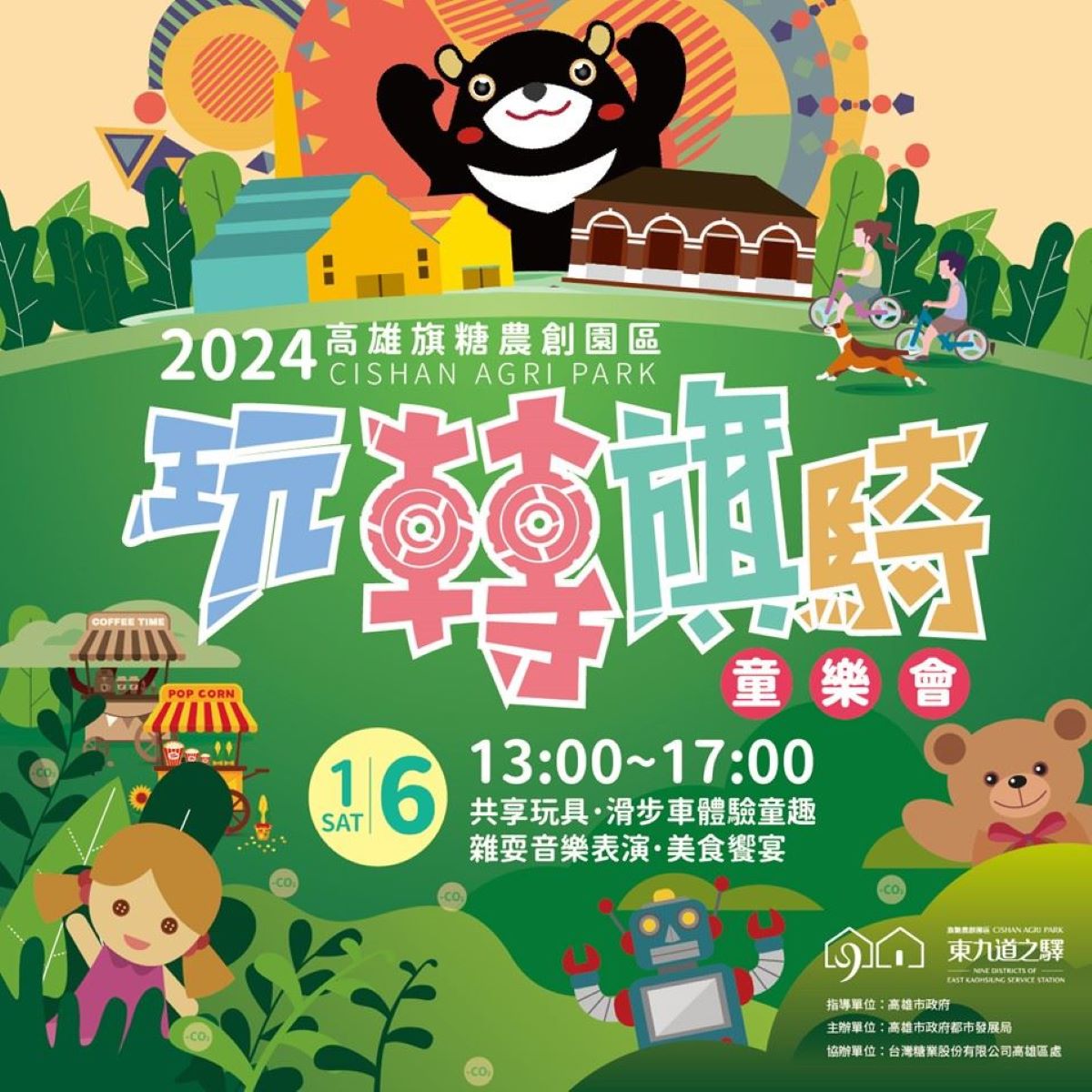 高雄市政府都市發展局為響應環境永續,特別與台灣玩具圖書館協會合作,以玩具共享全齡共玩為主題,於1月6日(六)在東九道之驛-旗糖農創園區舉辦「玩轉騎旗童樂會」,活動主題包括共享玩具體驗、滑步車體驗、美食饗宴及表演節目,活動當天主辦單位準備1000份小禮物,只要於園區內手機打卡即可兌換,還有限量80組野餐套組每組售價300元(內含手工藤編野餐籃、野餐墊以及300元美食饗宴兌換券),歡迎市民全家大小一起到園區展開2024年第一場輕旅行。
