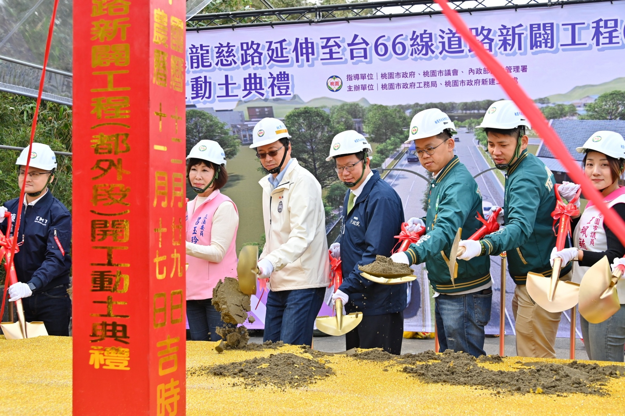 鄭副院長抵達開工動土典禮後,首先觀賞祥獅獻瑞的表演,致詞後,與桃園市張善政市長一同主持動土祭祀儀式,隨後與內政部吳容輝政務次長、立法院魯明哲委員、呂玉玲委員、桃園市議會王珮毓議員、彭俊豪議員、吳嘉和議員、黃敬平議員、陳韋曄議員、舒翠玲議員、梁為超議員、劉仁照議員、魏筠議員一起執起金鍬,起鍬三鏟,祈求工程順利圓滿並合影完成整個儀式。