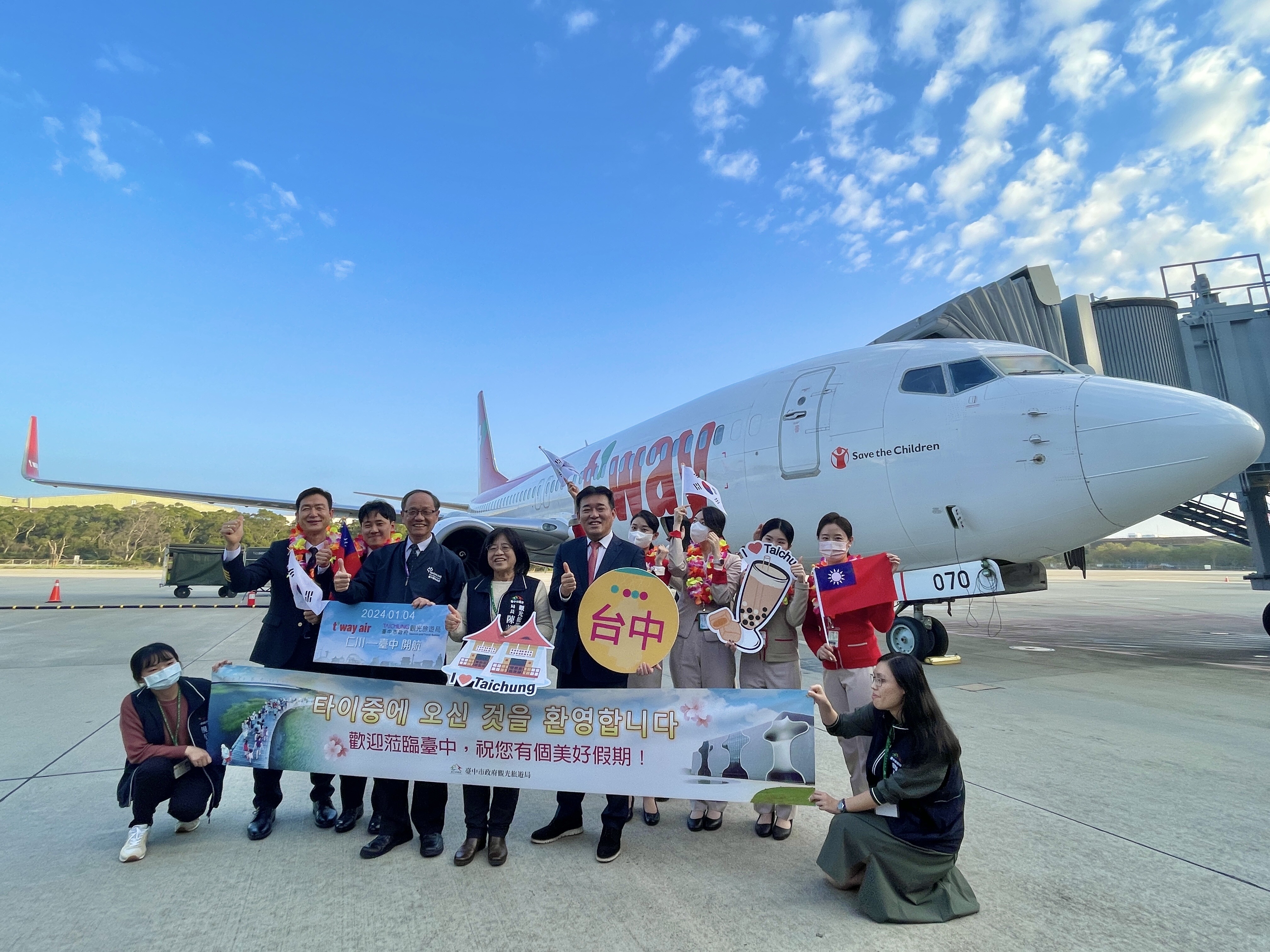 台中市政府拓展仁川航線連下三城!「德威航空」於4日重啟仁川飛航台中的定期化航線,滿載189名旅客的首班機飛抵台中國際機場,市府觀光旅遊局特別到場舉辦迎賓活動,由觀旅局長陳美秀代表致贈台中在地伴手禮及迎賓禮包,熱烈歡迎搭乘首班機的韓國遊客到訪台中。