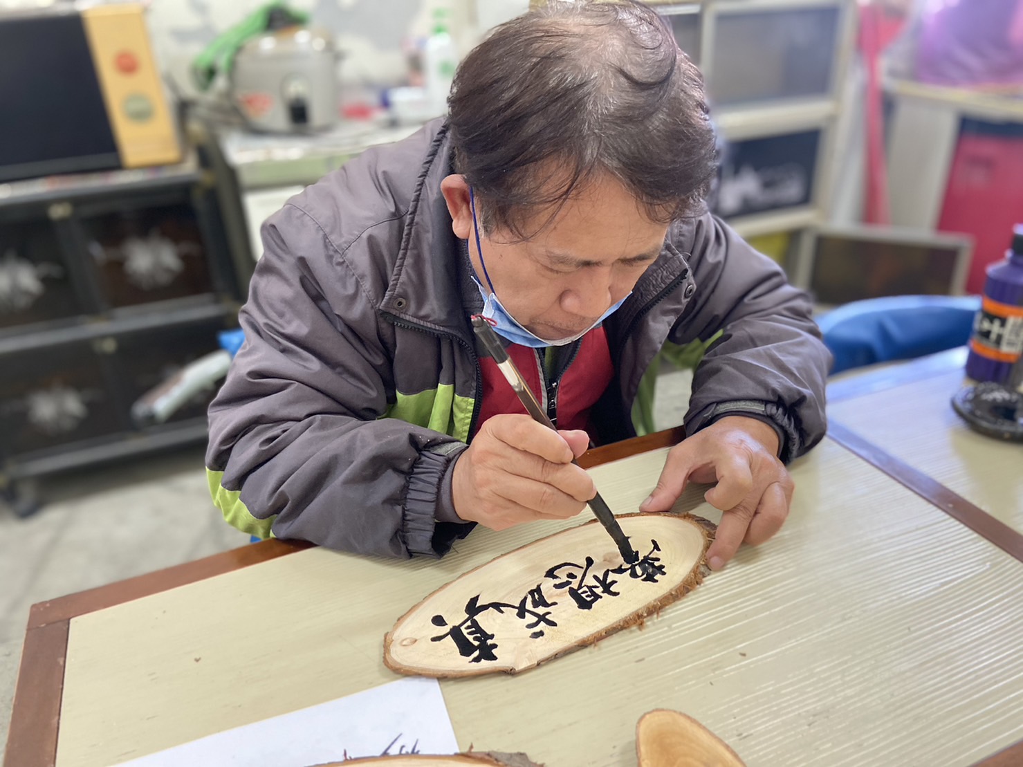 環保局說明,從挑選廢木到裁切成工藝材料,由原先從事裝潢木工業的隊員溫宋嘉峰一手包辦,他受疫情影響,轉職到清潔隊工作,因發現運用自身木工專長,可讓廢木重生再利用,而感到相當開心。另自學書法超過30年以上的隊員賴坤森則分享,以往春聯或是輓聯均採紙或布材質,首次書寫在木板上確實有不同的挑戰,且能將自己的作品供民眾兌換,他感到無比的欣慰。