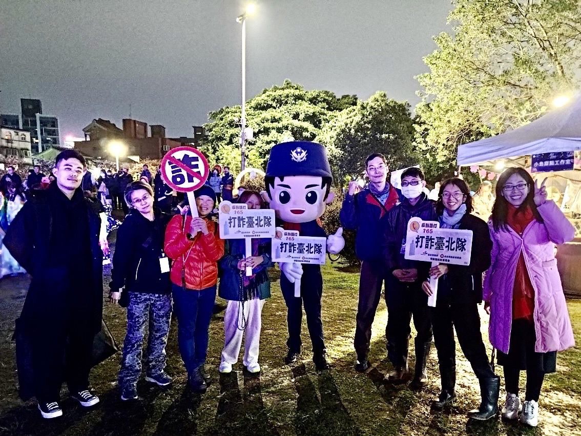臺北市政府警察局「打詐臺北隊」,為保護市民財產安全,特別結合本次活動,前往內湖樂活公園與民眾共賞綿延3公里的「櫻花步道」,以及粉色燈光投影所打造的夜光櫻花海「夜光電櫻」,並與民眾親切互動,提醒民眾辨識遭遇詐騙時可能遇上的話術。