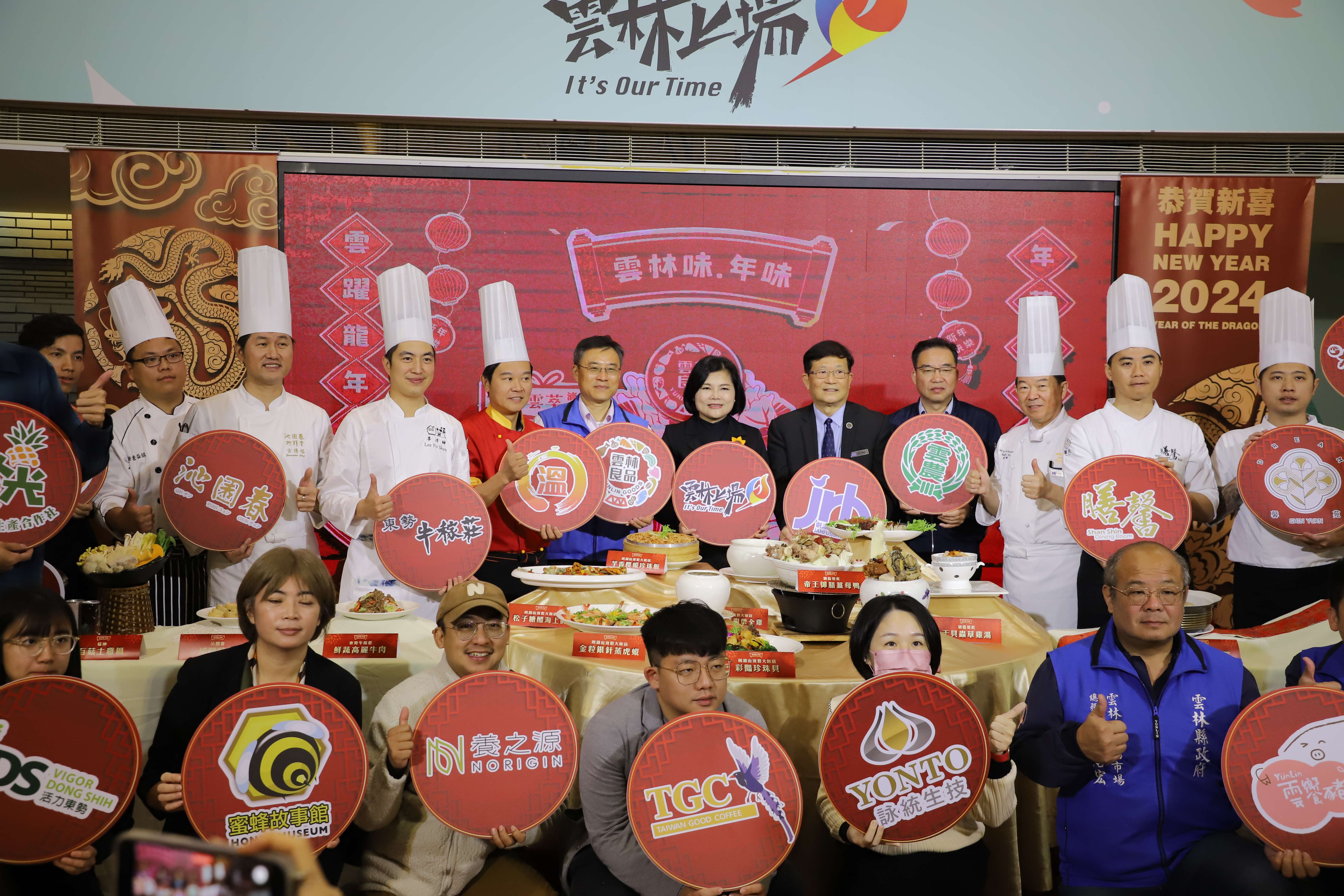 農曆新年將至,雲林縣政府今(30)日在縣府親民大廳舉辦「雲躍龍年遊四海 年菜伴手禮宣傳記者會」,邀請多位餐廳主廚端年菜走秀,搭配縣內伴手禮業者現場展示,提供民眾豐富多元的選擇;縣長張麗善表示,雲林縣是農漁畜產大縣,有最新鮮美味的各式食材,年菜、伴手禮一定要選購雲林良品,用最棒的料理跟親朋好友分享。
