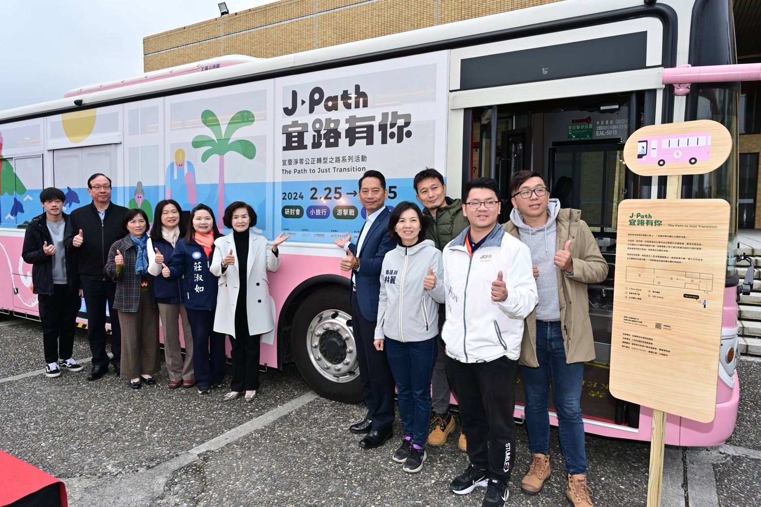 宜蘭j-path宜路有你「淨好生活·零的日常」,開出首台淨零主題展示之「淨零0 bus」,電動公車化身為行動博物館,今(26)日在宜蘭運動公園體育館前,由縣長林姿妙帶領宜蘭致力參與綠色行動青年,包含青年事務委員會委員、東北觀光青年軍、在地青農、青年志工以及國際青商會等各族群領袖,一同啟動宜蘭公正轉型之路系列活動。