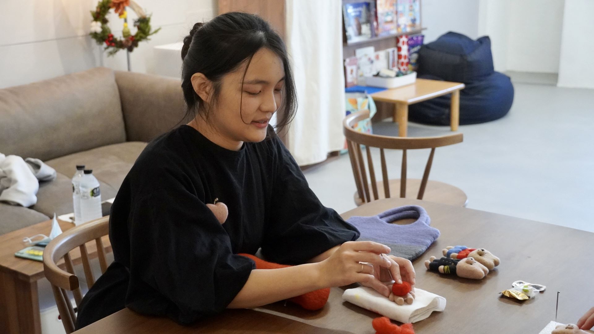 林檎老師說,多年前她收到一份羊毛氈禮物後就愛不釋手,對羊毛質地瘋狂著迷,從那一天起就開啟了屬於她自己的羊毛氈之旅,從不斷摸索到有能力開班授課,她取自己名字黃于蘋中的蘋字,以蘋果的日文漢字「林檎」為品牌命名,希望蘋果的喜潤紅色和平安象徵傳遞出更多的正能量。她認為相較其他手工藝,羊毛氈更好上手,僅需幾種戳針工具、羊毛與泡棉墊即可開始作業,這對於想嘗試手作的人們而言相當友善,因此這些年來,她一直努力將羊毛氈帶給人們的療癒感傳達出去,思索著自己的作品如何讓人產生共鳴。
