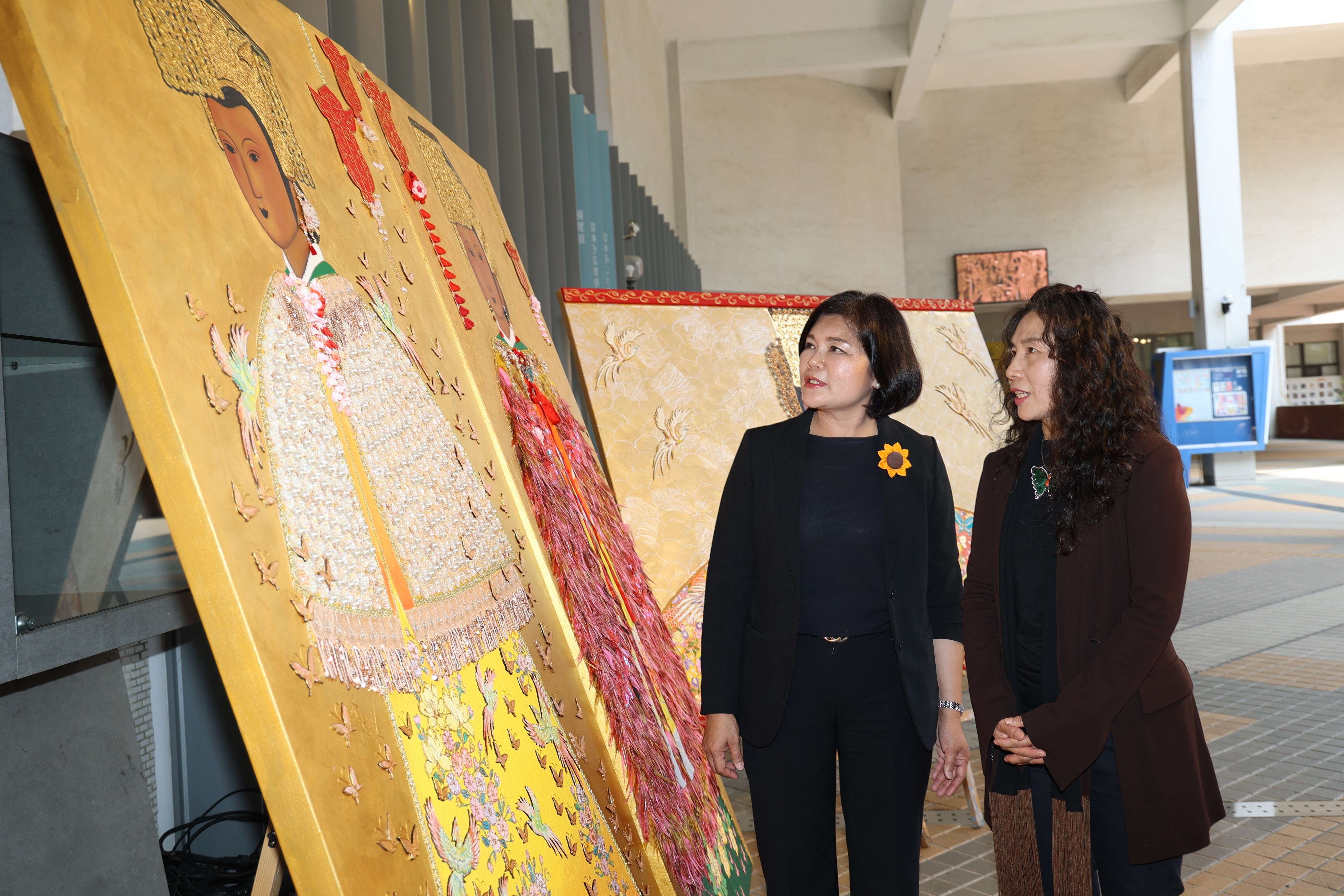 陳璧君處長指出,縣府特別跟蕙子老師共同辦理「媽祖文化藝術饗宴-藝韻繪影」藝術特展,不僅僅是對傳統信仰的呈現,更是一場別開生面的文化與藝術的交融,每一件展品都是一個視覺詩意的媽祖敘事,透過展場畫面和音律,呈現媽祖信仰中的故事和情感,並將其轉化為一場融合傳統信仰和當代藝術的藝術饗宴。蕙子老師(魏幼惠)的創作題材雖然是以媽祖畫像為主,但在媒材和技巧上皆是不同以往的創作方式,創作分別以金色、紅色、金橘等三色為主要搭配,結合多元複合媒材如紅珊瑚、檜木、羽毛、蕾絲、珠簾、金銀箔、翡翠珠寶等元素點綴鳳袍后冠,從媽祖身上的披肩、纓絡,到長袍的紋飾,在低頭俯視的姿態下,皆散發出媽祖神格的威儀與慈愛的面貌,並且巧妙利用顏色與顏色之間搭配,完成一幅幅驚豔動人的作品,讓每位觀賞者深刻感受到媽祖婆「慈悲守護」的感動。