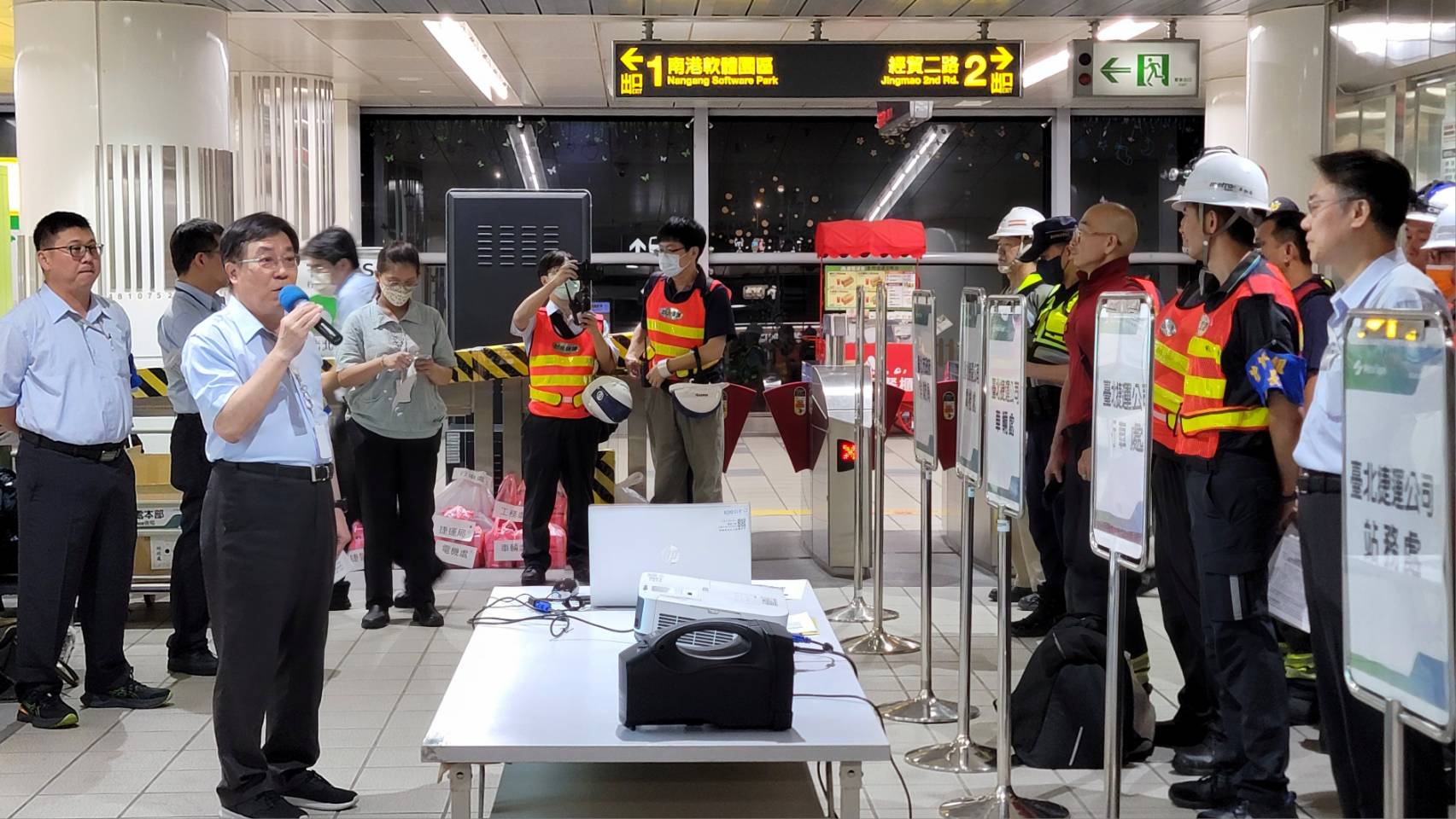 凌晨演練,臺北捷運公司指揮官副總經理陳建財全程參與,特別感謝市府各級長官及交通局指導,捷運工程局、消防局、捷運警察隊等市府相關單位投入演練,期許同仁落實演練情境及各相關單位橫向聯繫通報作業,平日做好演練,意外來臨儘速動員處理,維護旅客及系統安全。