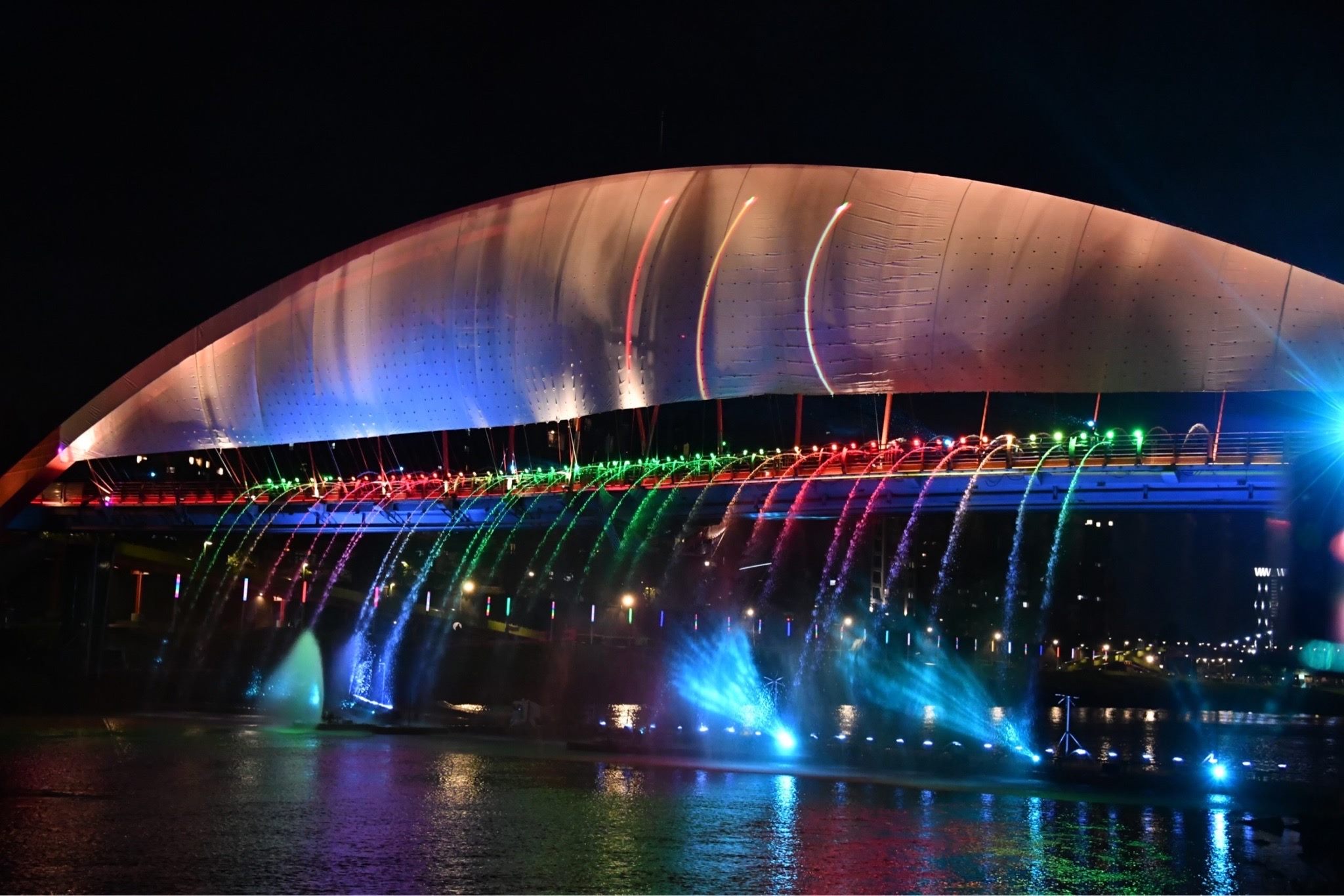 蔣萬安也分享水舞嘉年華的觀賞攻略,除了舞台這側,對面內湖麥帥橋下也是觀賞水舞的好地點,不同角度可看到不同風貌,雖然今天下著小雨仍不減精彩。另鼓勵大家搭乘捷運前來,可先到松山慈祐宮參拜或到饒河街夜市品嘗美食,再散步到錫口碼頭欣賞水舞秀,享受一個美好夜晚。